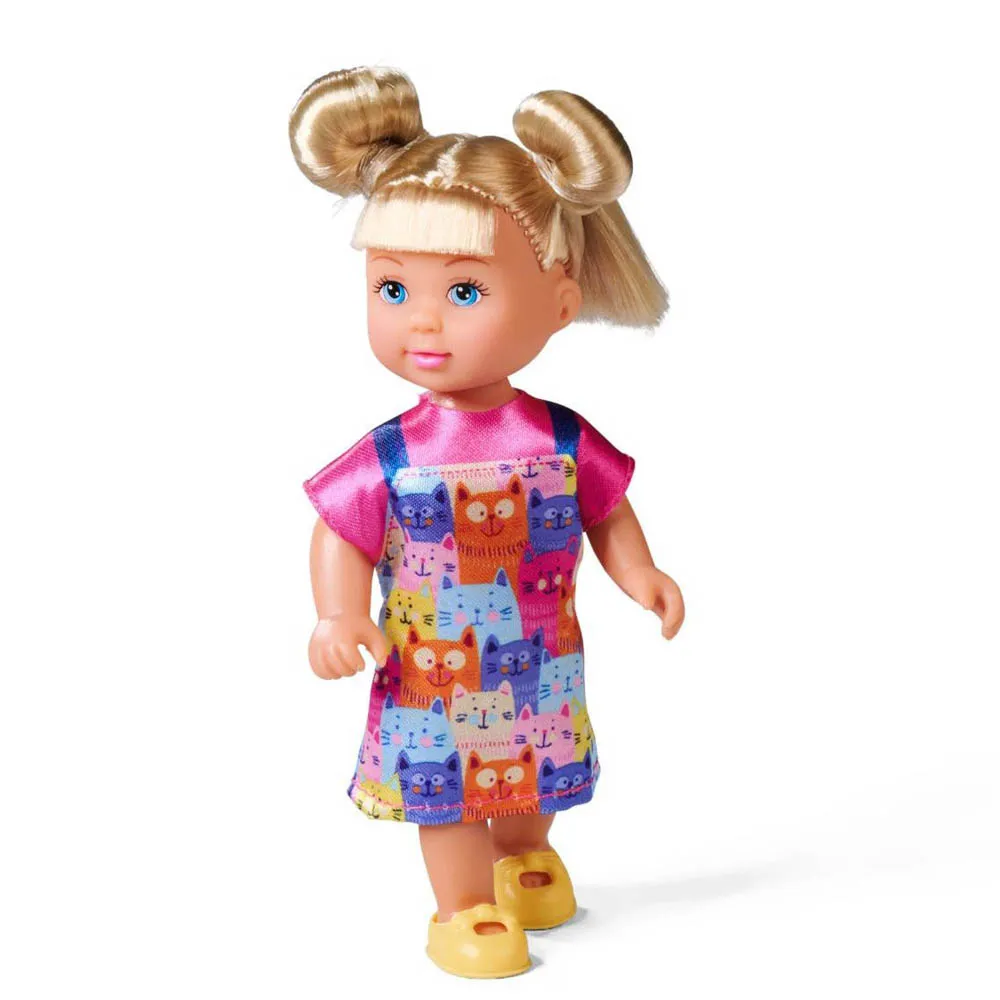Evi wearing a cute cat-print dress, including a scratching post, two cat figures, and lots of accessories to care for her furry friends.