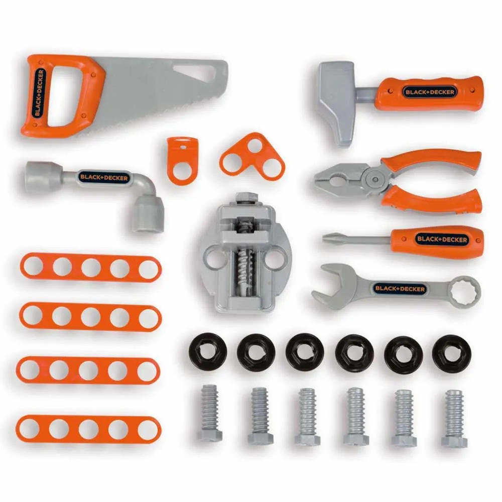 Attention craft professionals aged three and over! With the Smoby Black+Decker workbench in a case, you are perfectly equipped for all jobs at home or when travelling. The large case is easy to open and with a few simple steps you have a mobile workbench in the original Black+Decker design. The compact workbench offers everything a DIY enthusiast could wish for when it comes to screwing, constructing and tinkering, allowing you to drill, hammer and screw while familiarising yourself with the various tools. The 33 accessories included are realistically designed a saw, hammer, spanner, screwdriver, pliers, socket spanner, a vice for clamping and fixing, 10 screws with nuts and a set of construction elements. Practical hooks and shelves are available to store everything within easy reach. And at the end of the game, everything is stowed away in the large case so that nothing gets lost when travelling. Made from high-quality, hygienically cleanable plastic, the Black+Decker workbench in a case is produced in the Smoby factory in France and guarantees safe and long-lasting playtime fun. Expandable and compatible with all Smoby Black+Decker tools.