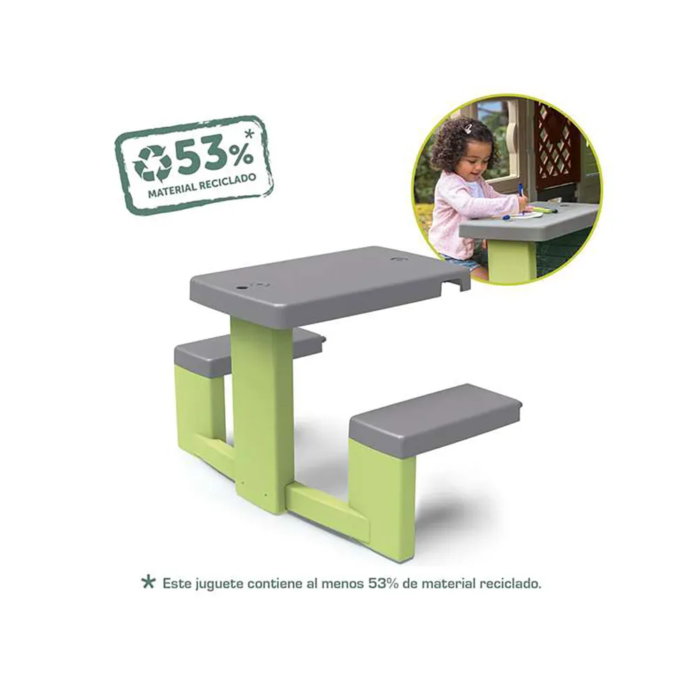 Picnic table adapted to Smoby playhouses which are compatible. It is composed of 2 benches and 1 space for the snack of several children. Plastic pieces are anti-UV treated for a good resistance and a better colors durability over time. For children aged 2 years and over. This toy contains at least 53% of recycled material.