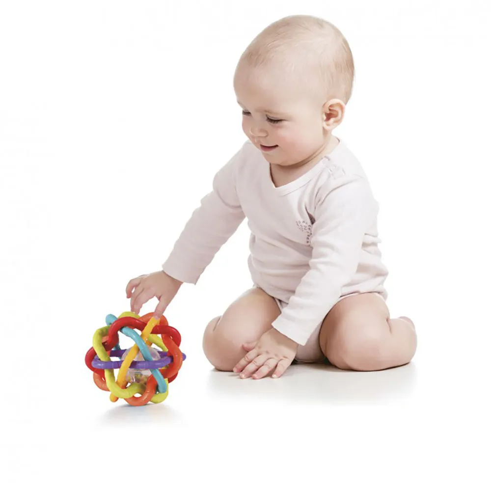 Colorful ball with numerous grip options, With an integrated rattle, Motor development, Sensory training of sight, hearing and touch.