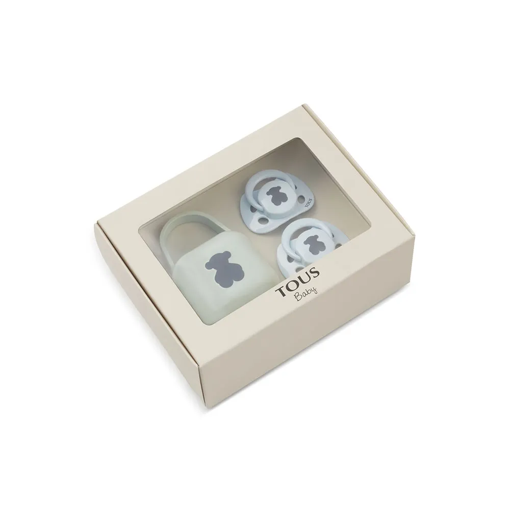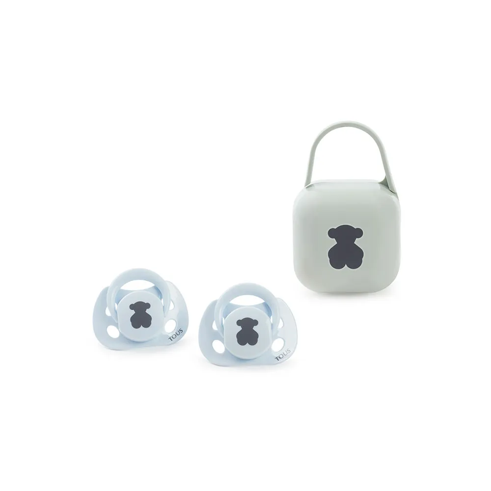 2 pack of Baby Tous anatomical dummies and dummy holder for babies aged 0-6 months. Dummies with anatomical silicone nipples. This is the most recommended type of nipple as it ensures that the tongue remains in the same natural position as when the baby suckles. It allows more space for the tongue in the oral cavity, allowing the maxilla and mandible to develop. Dummy holder with a capacity for holding up to 2 pacifiers with a flexible handle that can be hung anywhere (6 cm wide x 7 cm deep x 11 cm high).