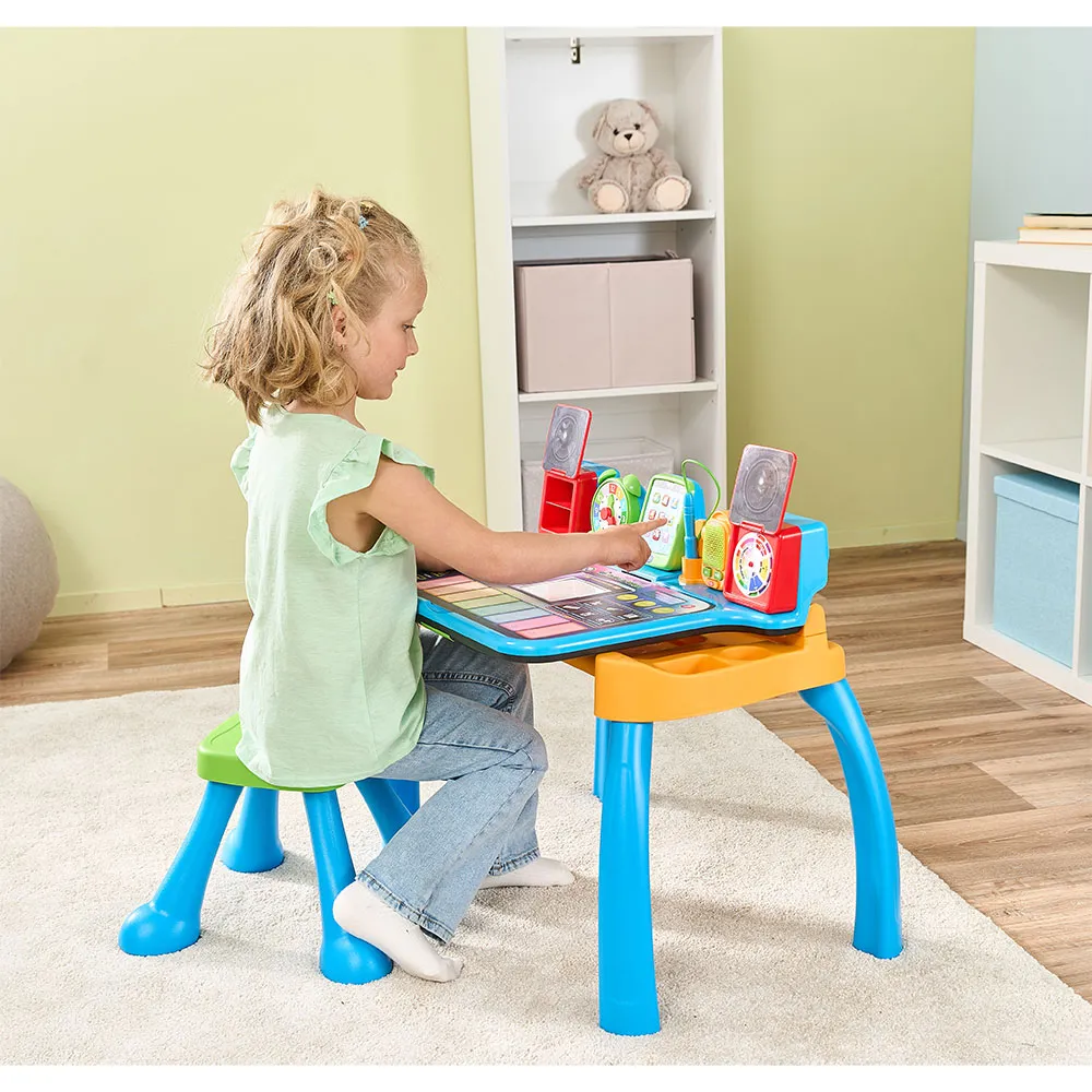 Lift the lid and the table flips into a music studio where three styles—pop, techno and jazz—five instruments and piano keys let budding composers mix beats, change pitch and write their first tunes, tuning the ear and sense of rhythm.