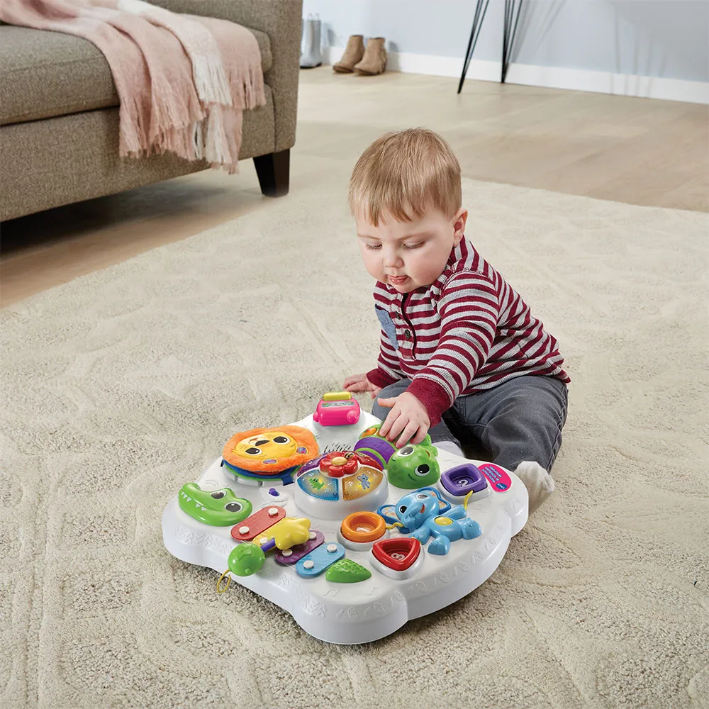 Explore a world of fun with the VTech Sensory Activity Table! Designed for babies 12+ months, this durable toy features 6 engaging play areas. Little ones will love the crocodile xylophone, textured turtle, interactive shapes, and toy phone. Turn the flower wheel to hear melodies and press buttons to learn numbers, colors, and animals. The central panel is removable for 2-in-1 fun as a table or for floor play. With lights and sounds, it’s perfect for boosting sensory, motor, and language development