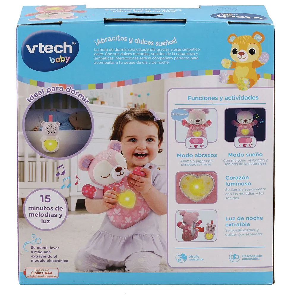 Introducing the Peluche de cuna Osito melodías by VTech! This soft and cuddly on the go bear is great for snuggles and cuddles.