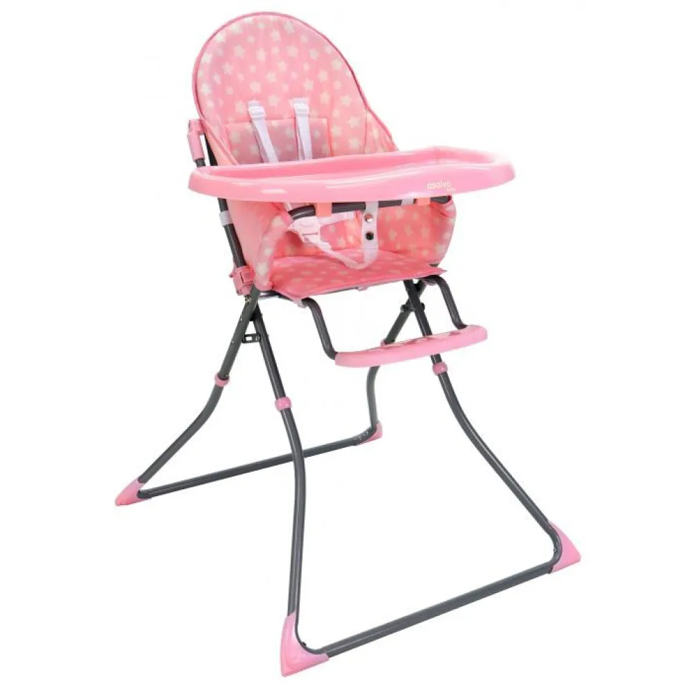 Tiene un respaldo fijo, bandeja plegable, reposapiés y arnés de seguridad.
