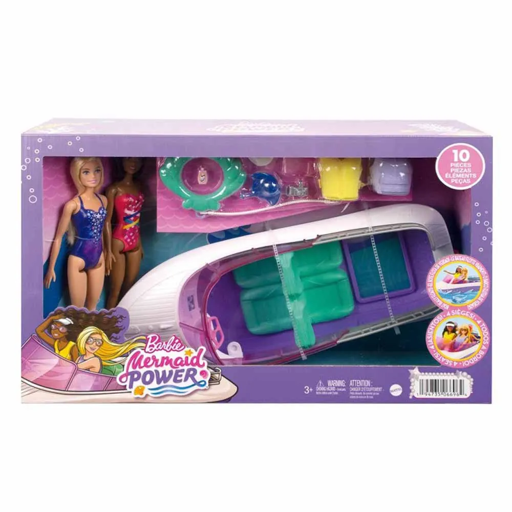 ¡Sumérgete en la aventura con la muñeca y el set de juego BARBIE Mermaid Power Barco! Coloca a Barbie en su barco y empuja la palanca para una transformación mágica: ¡se voltea para revelar una cola de sirena brillante! La muñeca Barbie articulada está lista para cualquier historia, con su propia cola extraíble para jugar en tierra o mar. Recrea escenas de la película o inspira un sinfín de historias submarinas con este vibrante set, una puerta de entrada perfecta a un mundo de diversión imaginativa y magia de sirenas. Es el regalo definitivo para jóvenes aventureros y fans de Barbie