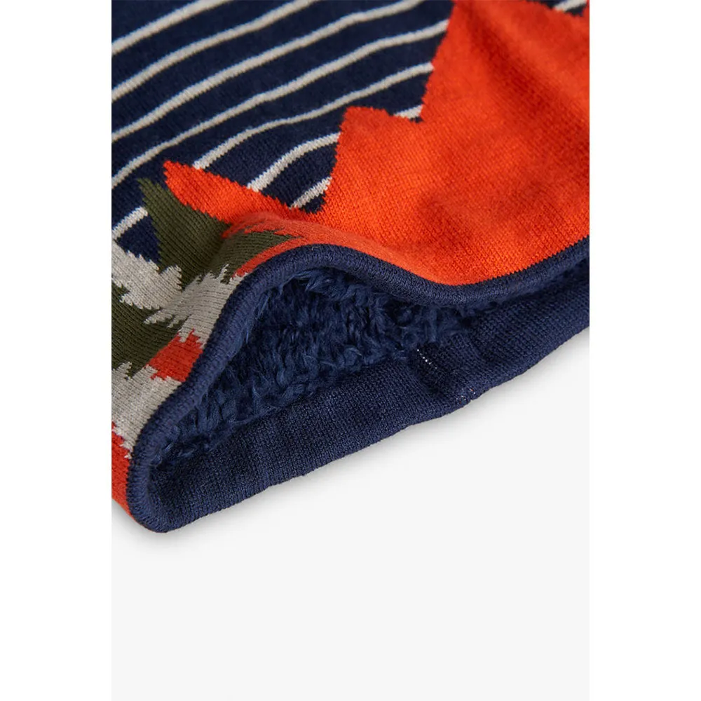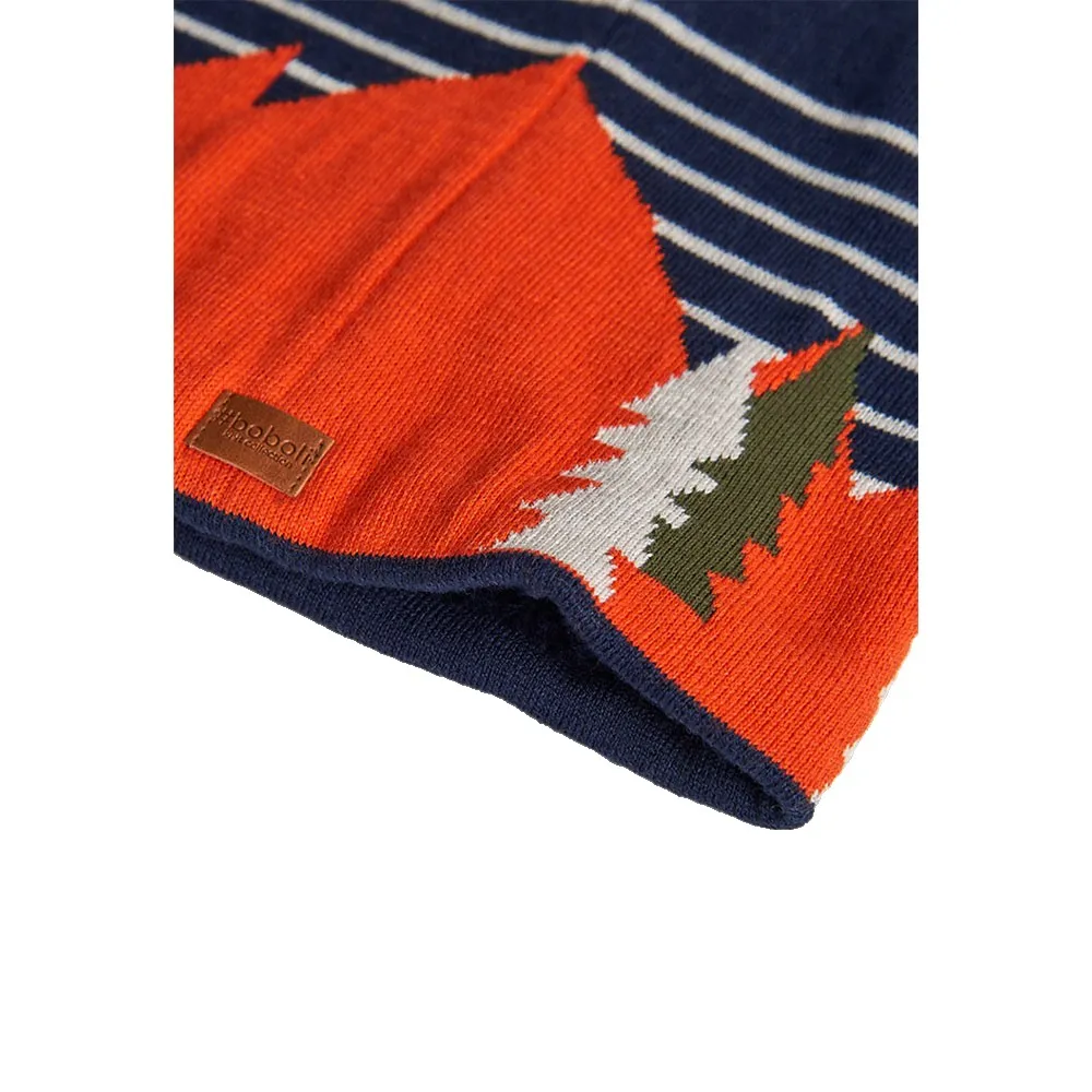 Bufanda de punto para niños en azul marino con un diseño encantador de montañas naranjas y árboles verdes, que destacan sobre el fondo azul marino.