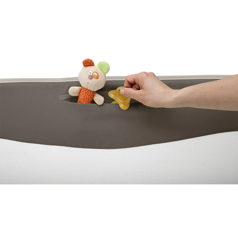 La barandilla tiene una ventana de malla y un práctico bolsillo para guardar los accesorios nocturnos (chupetes, peluches, etc.).
