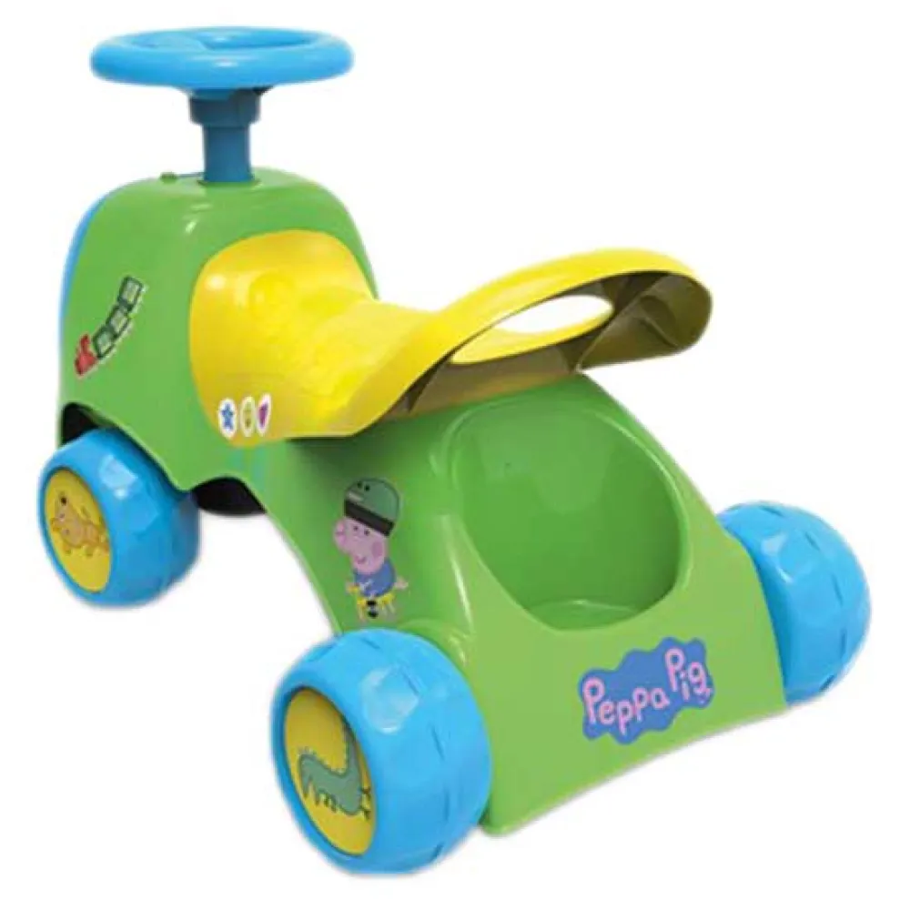 ¡Embárcate en aventuras oinktásticas con el correpasillos oficial de CHICOS de Peppa Pig! Perfecto para los pequeños fans, este vibrante juguete de arrastre fomenta el juego activo, ayudando a fortalecer las piernitas y a mejorar el equilibrio. Diseñado para la seguridad y estabilidad con ruedas anchas, es el siguiente paso perfecto para los niños pequeños seguros de sí mismos. A los pequeños conductores les encantará el volante funcional, la divertida bocina chirriante y el compartimento secreto bajo el asiento para sus tesoros favoritos. Es el juguete ideal para dar vida al alegre mundo de Peppa Pig a través de la diversión imaginativa y de desarrollo