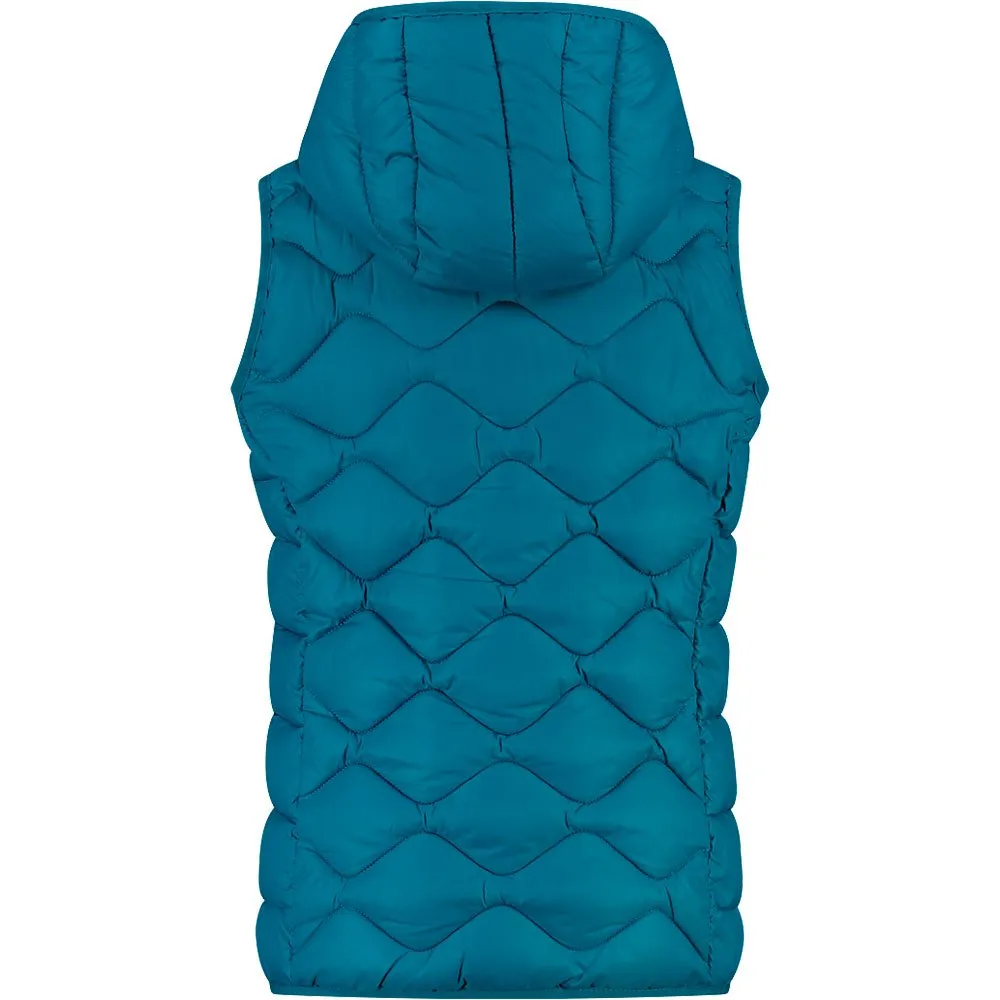 Chaleco con pespuntes geométricos acolchado con fibras sintéticas flocadas de tacto cálido que no solo son aislantes y ligeras sino también poco voluminosas.