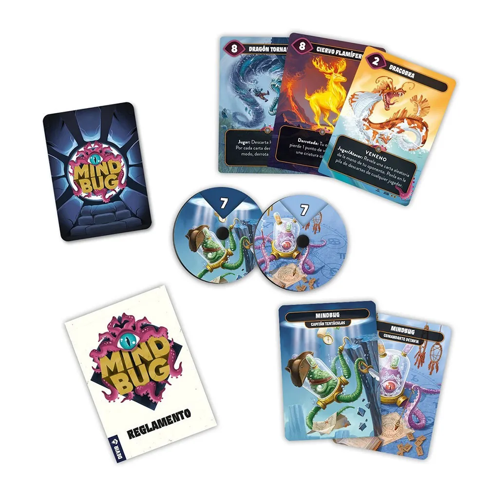 The Gathering o King of Tokyo, Mindbug es un juego de cartas para dos jugadores, a partir de 8 años, que permite partidas de entre 15 y 25 minuto? Para empezar a jugar, solo hace falta barajar y reparti? Cada jugador recibe 5 cartas, listas para jugar en la mano, y 5 más que se reservan boca abaj? Este conjunto de 10 cartas forma el plantel de criaturas que enviarás a la batalla con el objetivo de derrotar a tu riva? A continuación, cada jugador toma tres cartas más boca abajo que servirán como marcadores de puntos de vid? Finalmente, cada jugador toma dos cartas de Mindbu? En su turno, los jugadores podrán hacer una de las siguientes acciones: