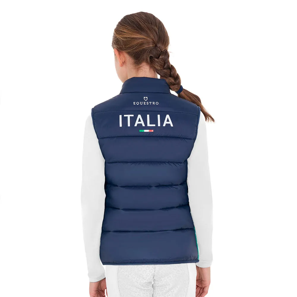 La prenda está adornada con una cremallera con sistema cortavientos y dos bolsillos laterales, así como una ribete de cordón con la bandera italiana a los lados y el logotipo de Equestro X FISE en el pecho.