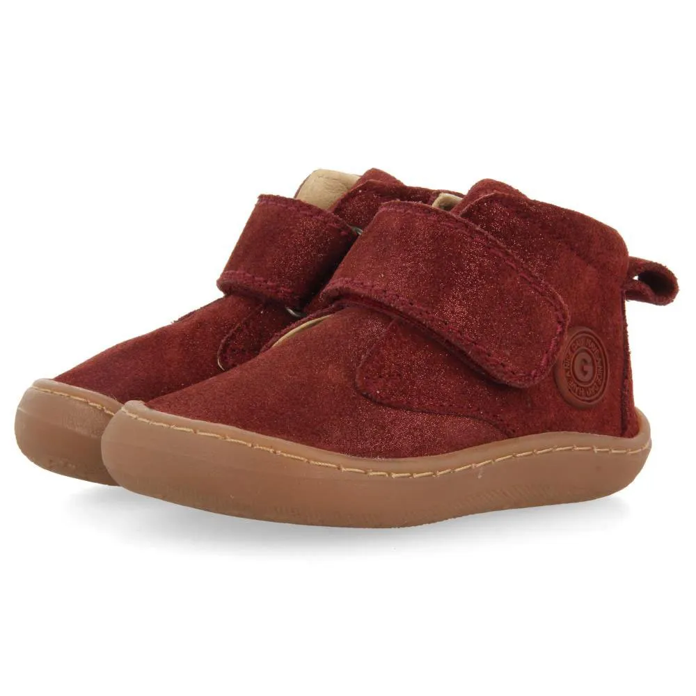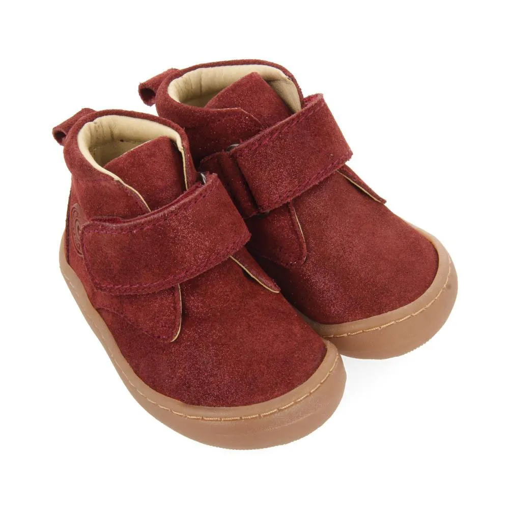 Botines burdeos con purpurina y cierres ajustables sin elementos anatómicos que puedan dificultar el desarrollo óptimo del pie.