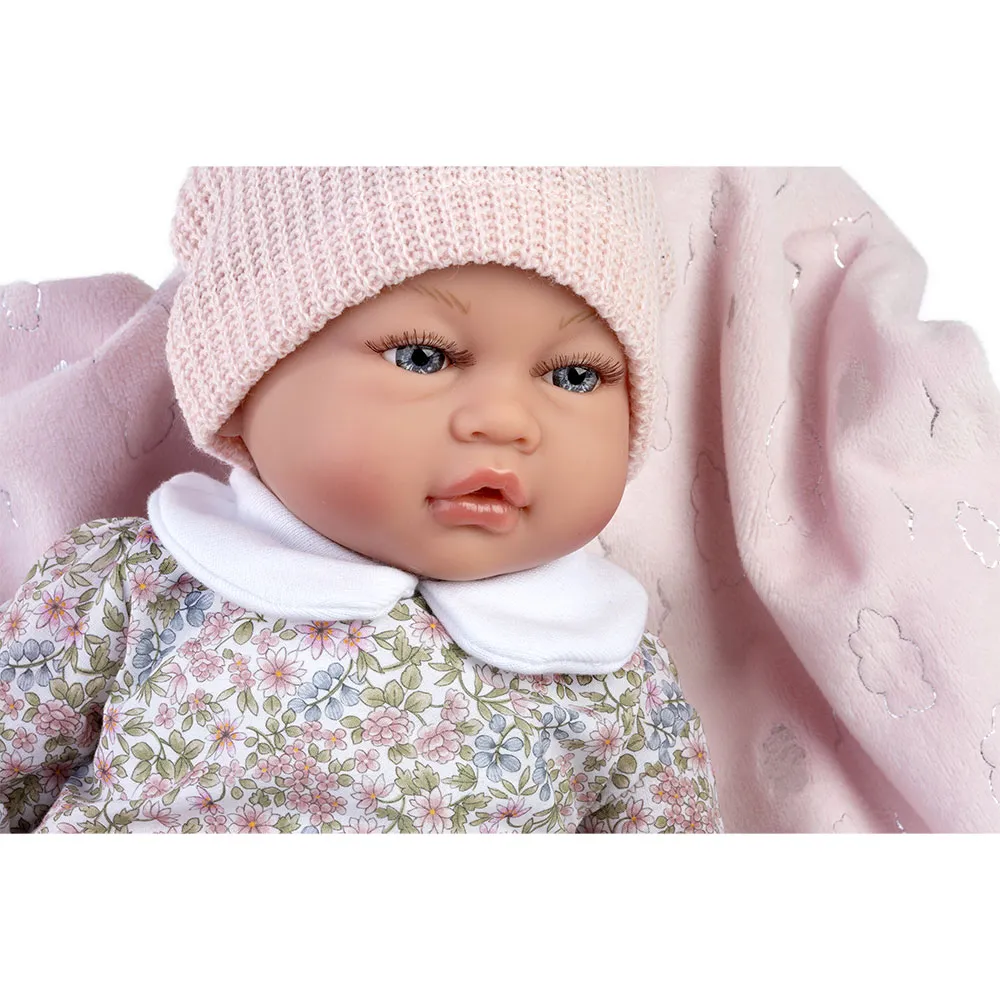 Muñeca lastrada Bruna, lleva unos leggings y un gorro de lana rosa.