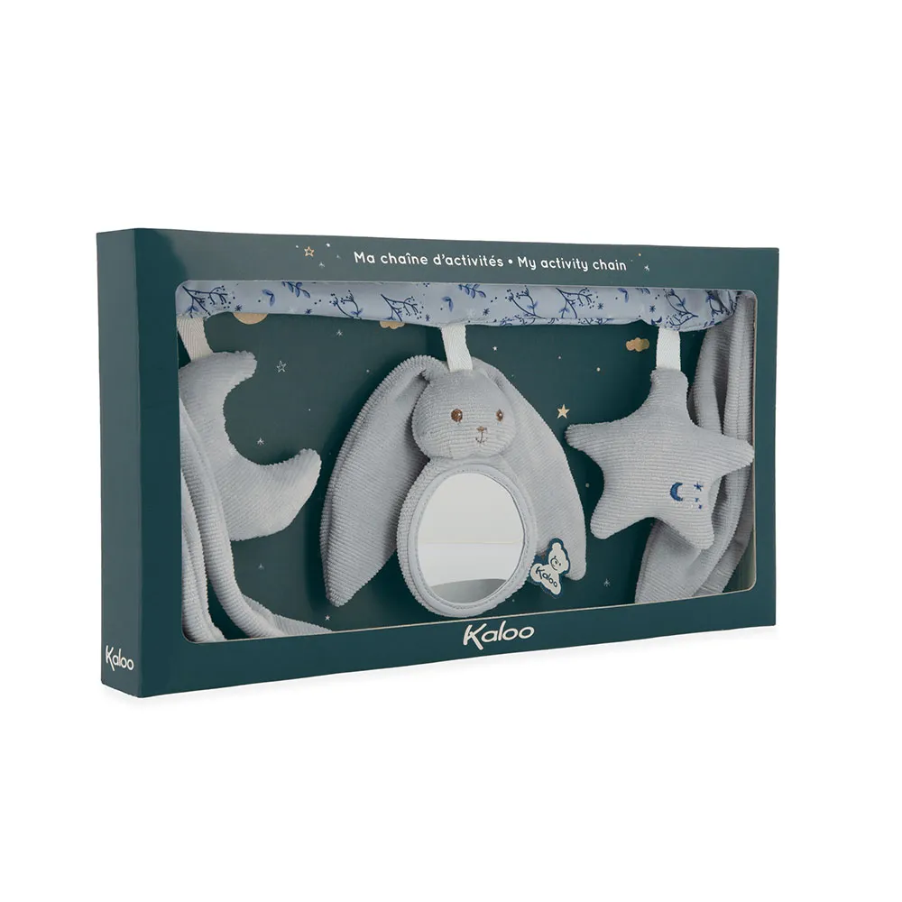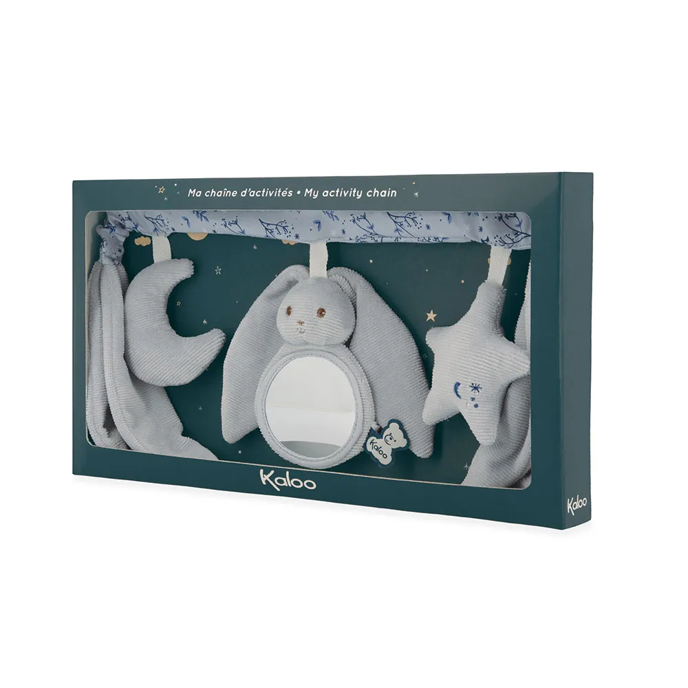 ¡Sí, las grandes orejas de nuestros conejos Kaloo les permiten columpiarse hasta el cielo estrellado! Hecha de pana, popelina (poliéster) y relleno de poliéster reciclado, esta cadena de actividades azul ayuda a desarrollar el tacto, la vista y el oído del bebé.