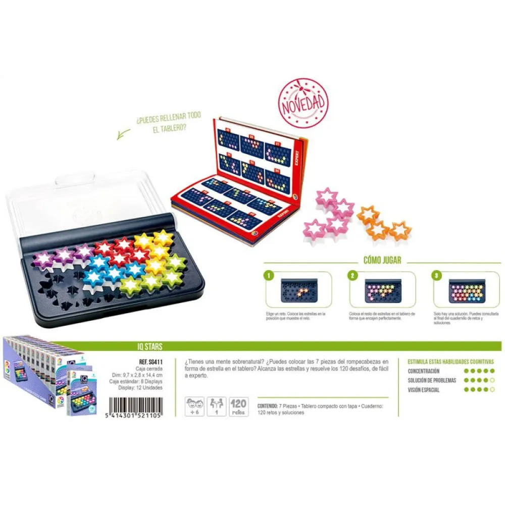 Elige un reto, coloca las estrellas según el reto y coloca el resto de estrellas en el tablero para que encajen perfectamente.