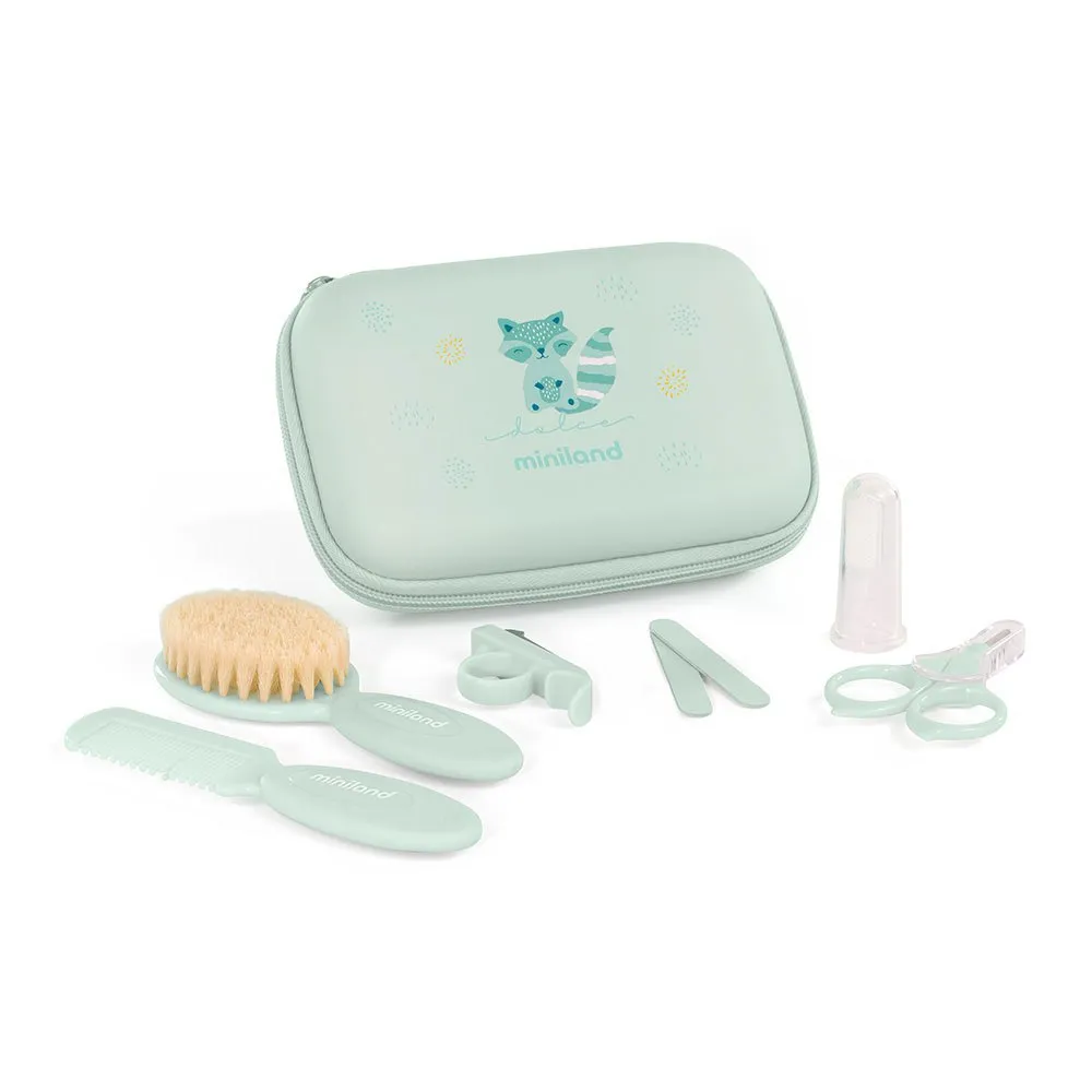 Este set se compone de un neceser con espacio para todos los accesorios necesarios para el cuidado e higiene del bebé, como tijeras para cortar uñas, un par de limas aptas para bebés, un peine, un cepillo de cerdas suaves y un cepillo de dientes de silicona.