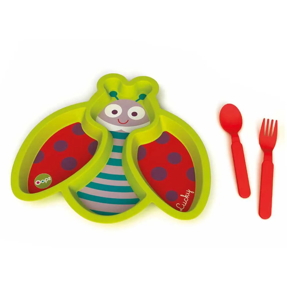 Set compuesto por plato con compartimentos, tenedor, cuchara y botella de 300 ml.