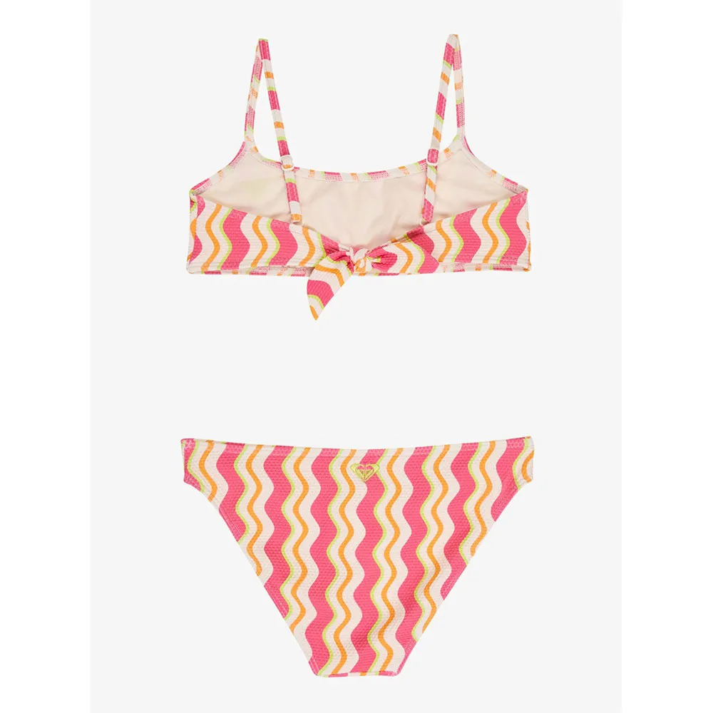 Tejido:Tejido reciclado suave, elástico y resistente con textura piqué, Diseño:tipo bralette, Relleno:Relleno extraíble en tallas para 12- 16 años., Correas:Correas ajustables con anillos y deslizadores, Cierre:lazo, La posición del estampado puede variar de un bikini a otro, Logo ROXY bordado y Nudo decorativo en la parte trasera.