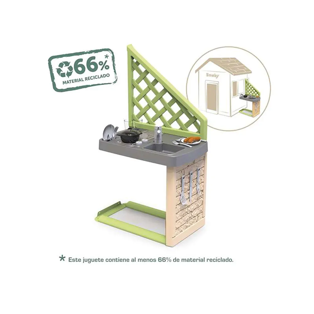 La cocina de verano Smoby Life, fabricada con al menos un 60% de plástico reciclado, es el complemento perfecto para una variedad de casitas Smoby. Aquí, los pequeños chefs pueden dar rienda suelta a su creatividad y preparar sus platos favoritos. Disponible por separado, se puede montar fácil y seguramente en la pared exterior de la casita gracias a las instrucciones detalladas. Cuenta con una zona de cocción para cocinar y asar, o para preparar perfectamente todos los ingredientes. Con 17 accesorios, incluyendo platos, cubiertos y salchichas a la parrilla, los niños pueden dejar volar su imaginación. Todo se puede limpiar en el fregadero.