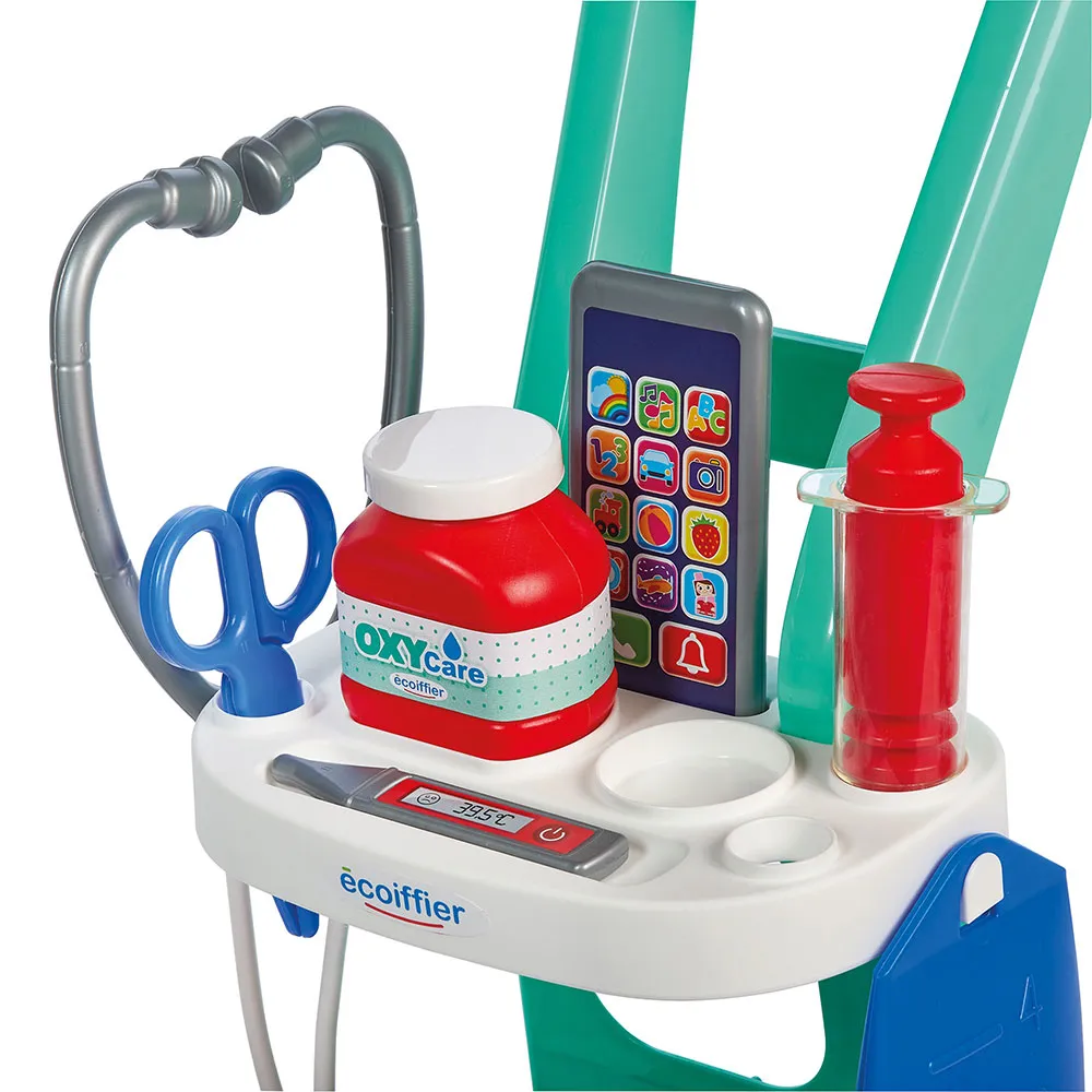 Este robusto y colorido carrito médico está repleto de características diseñadas para mejorar la experiencia de juego. Cuenta con un carrito resistente y fácil de maniobrar con ruedas que giran suavemente, lo que permite a los jóvenes médicos hacer sus rondas con facilidad. El carrito proporciona un amplio espacio de almacenamiento para todos los accesorios médicos esenciales, manteniendo todo organizado y de fácil acceso.