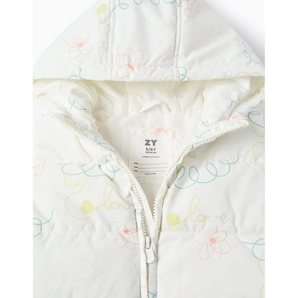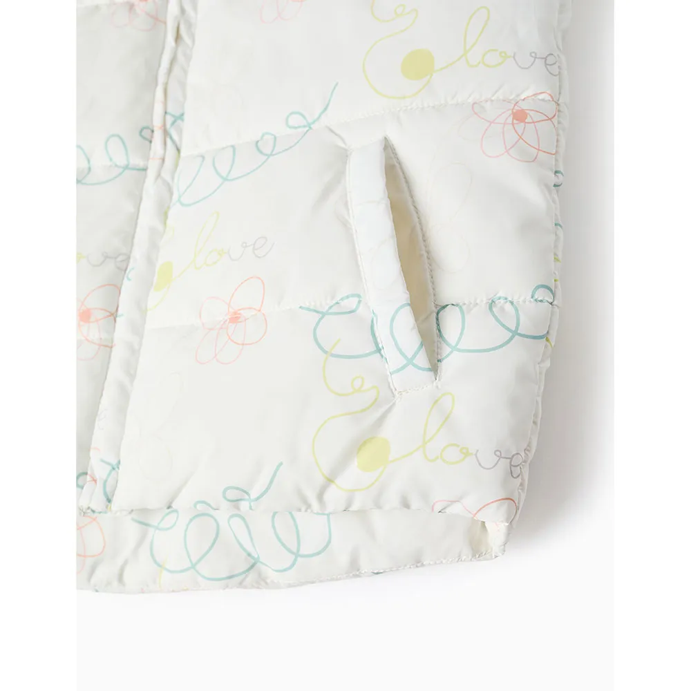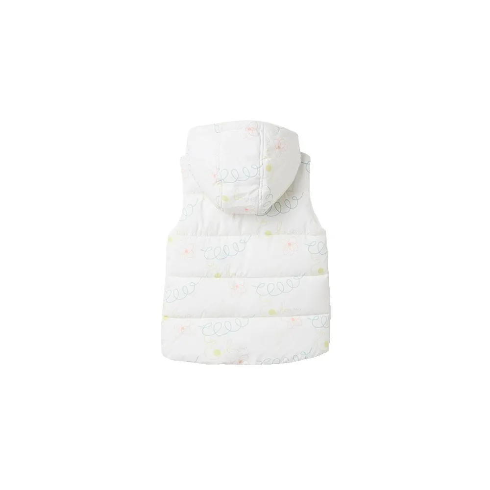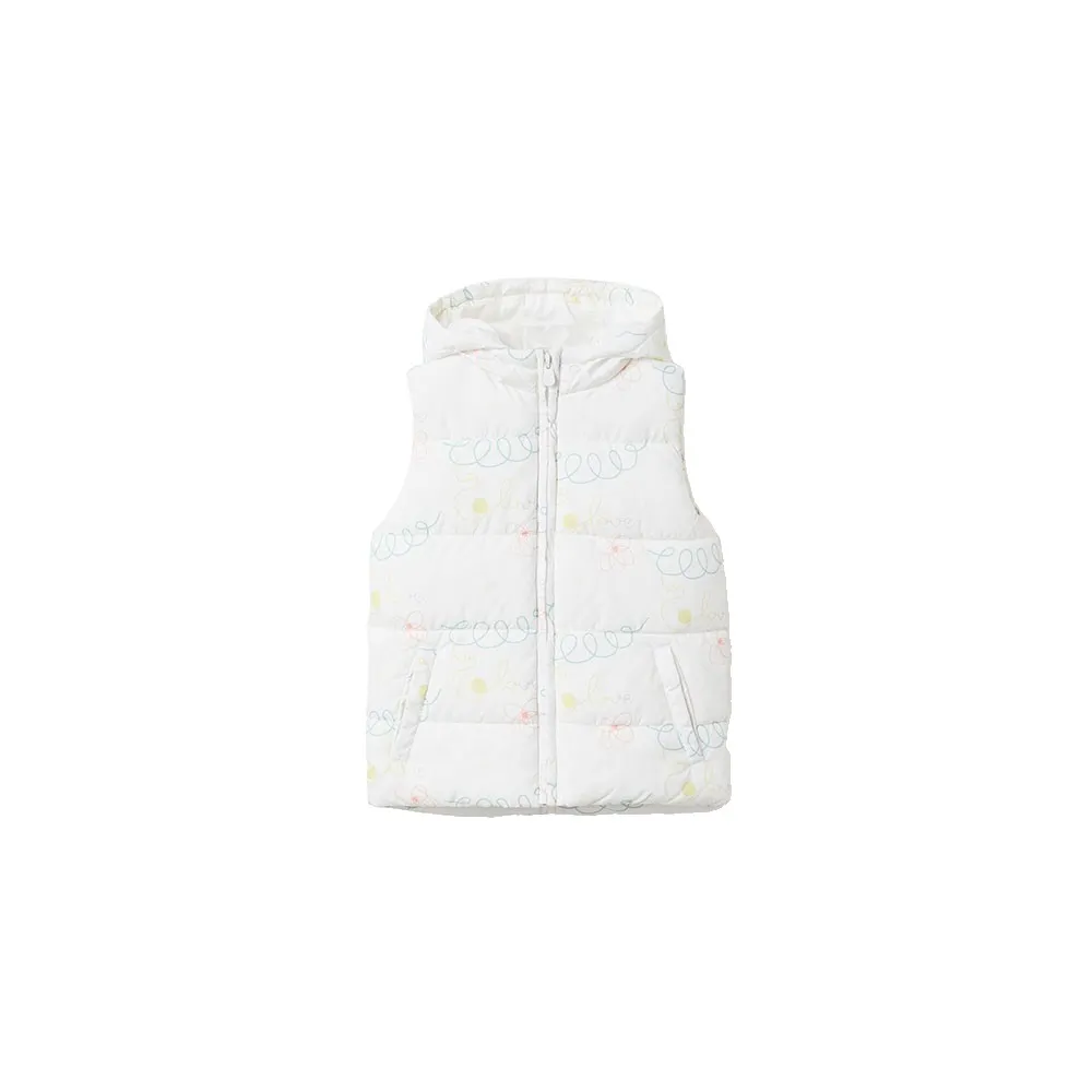 Chaleco acolchado con capucha para niña, con motivo. Bolsillos laterales. Se abrocha con cremallera para facilitar el vestir. Etiqueta interior para escribir el nombre del niño/a. We Care: el relleno de esta prenda está hecho de poliéster reciclado. Perfecto para jugar en el parque.