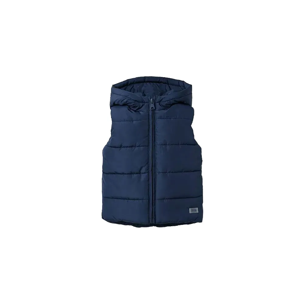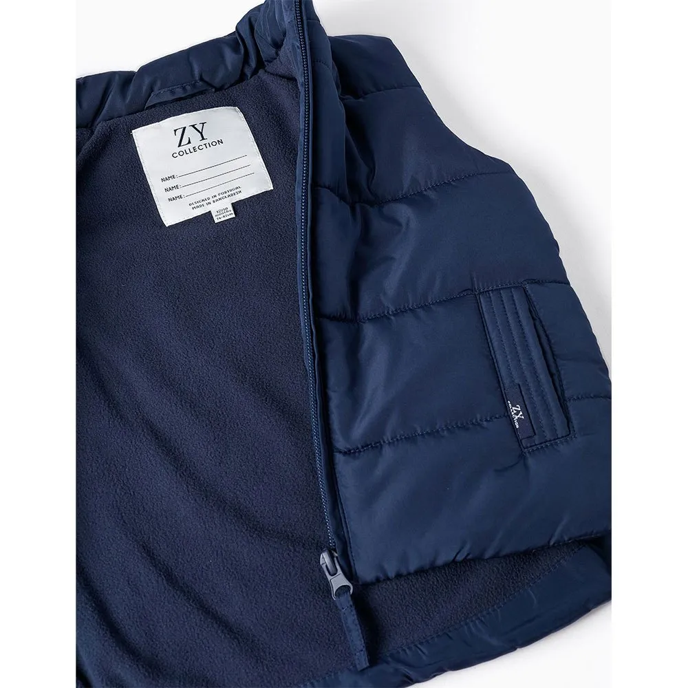 Chaleco acolchado azul marino para bebé niño, con forro polar para mayor confort térmico.