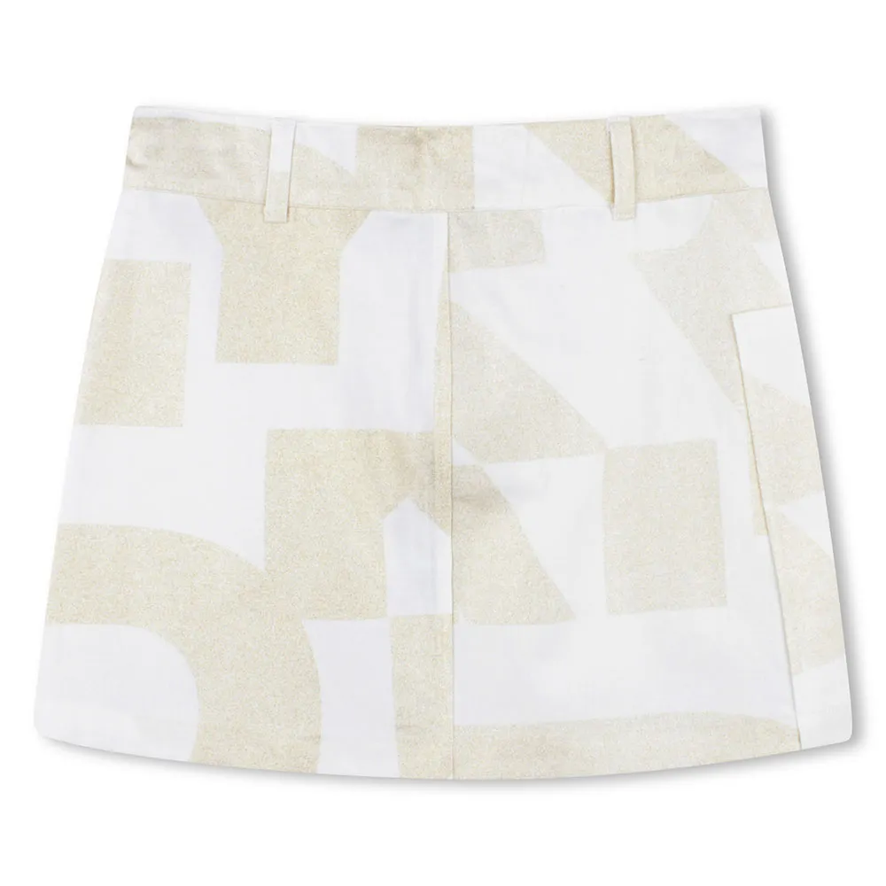 Puuvillapellavainen lyhythame, suora istuvuus, aikuisvaatteista inspiroitunut kultainen kuosi (85 % puuvillaa, 15 % pellavaa).