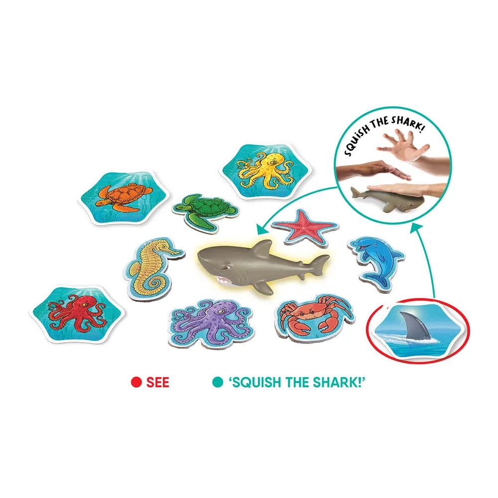 Paranna sopeutumiskykyäsi. Sisältö: 72 pelikorttia, 12 haikorttia, 6 merieläinmerkkiä, 1 hai, 1 ohjeet.