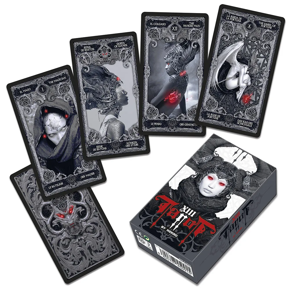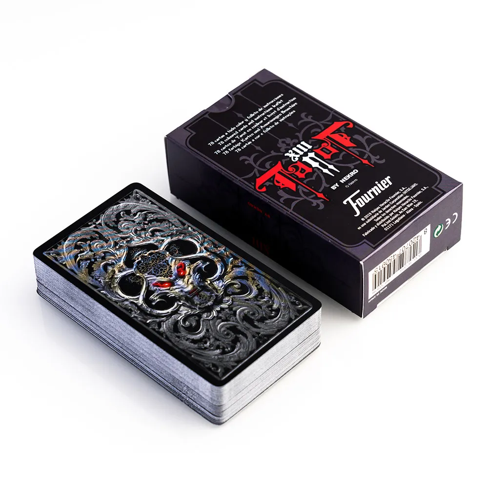 60x110 mm:n tarot-kortit, jotka on painettu eksklusiiviselle 330 gramman päällystetylle laminoitua paperia ja päällystetty erittäin kestävällä UV-lakkauksella.