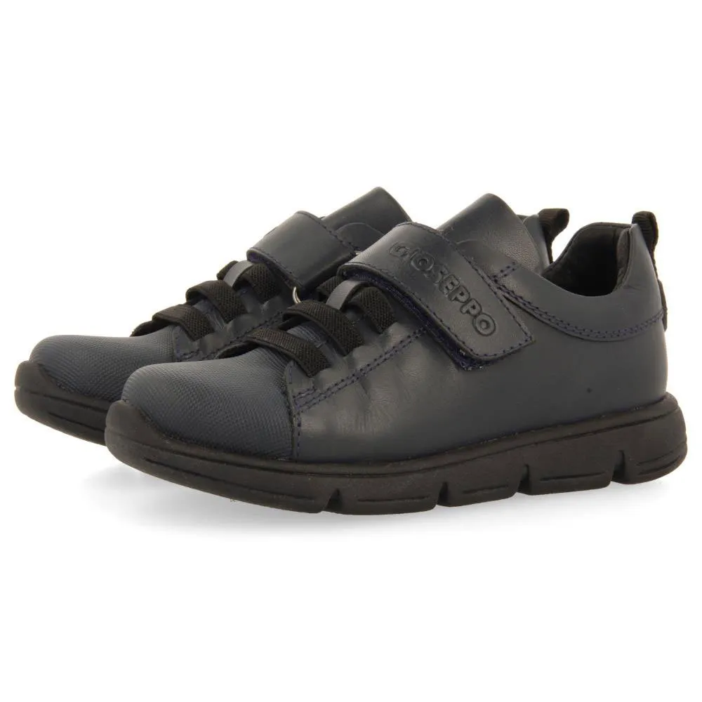 Tummansiniset nahkaiset tennarit säädettävillä tarranauhoilla ja joustavilla nauhoilla.