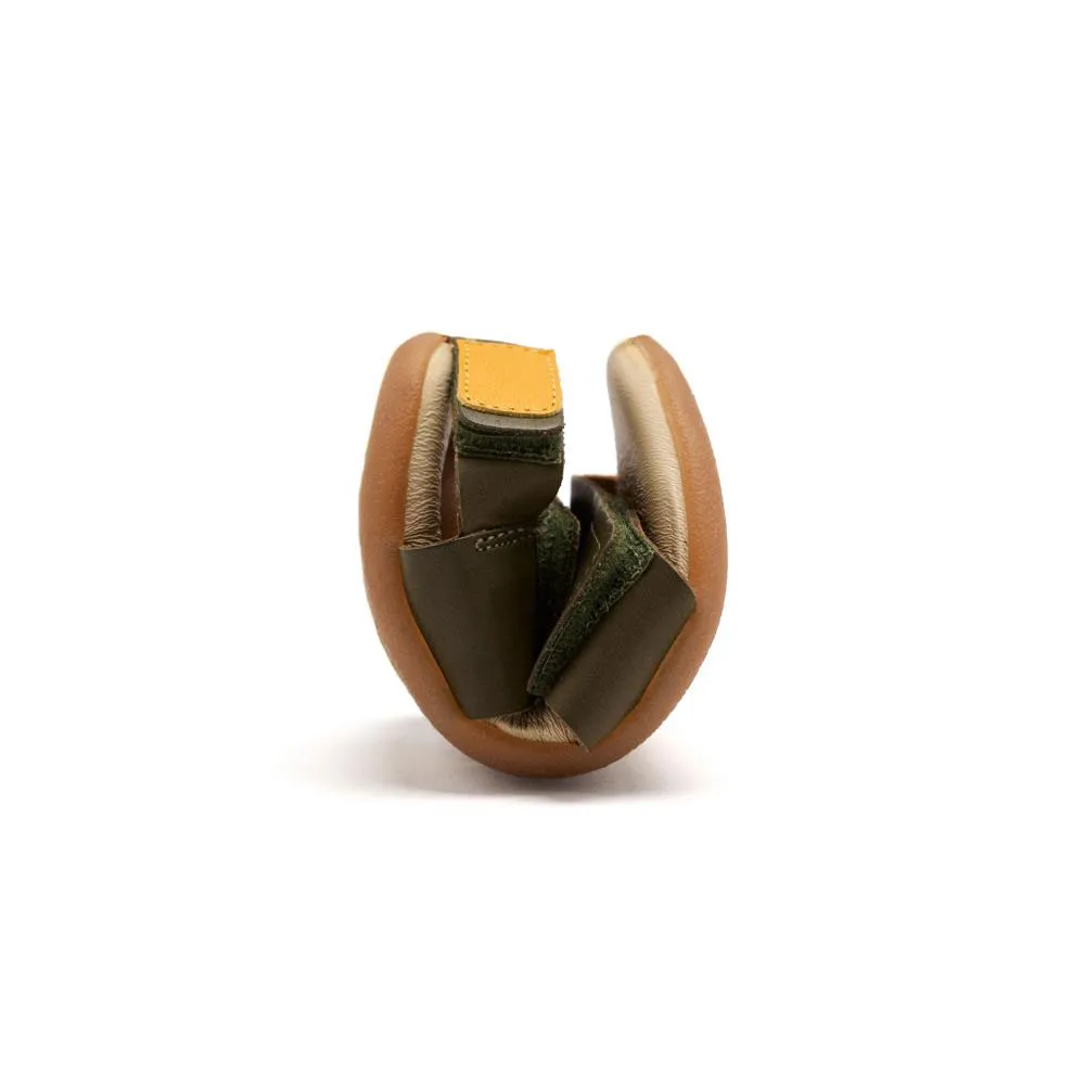 Kiiltävät nahkasandaalit.