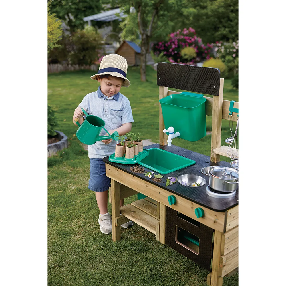 Tässä ulkokeittiössä on vesisäiliö, hana ja pesuallas sekä liesi ja uuni, joissa on kaikki tarvittava leipomiseen.