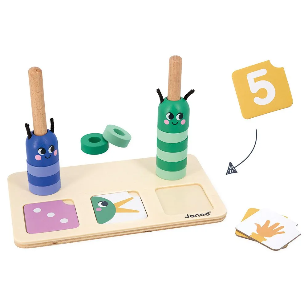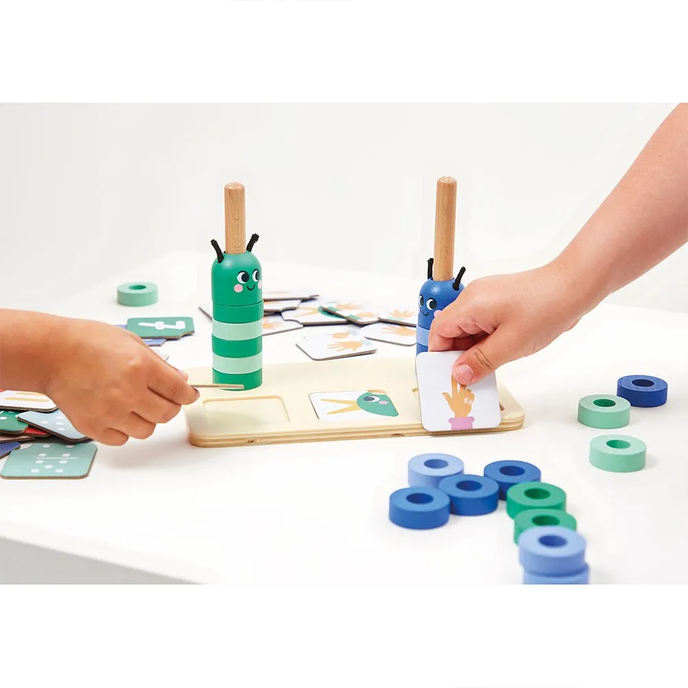 Lapsi ymmärtää, kuinka monta helmeä hän joutuu lisäämään tai poistamaan toukan varresta, kun hän pinoaa värikkäitä osia pohjaan.