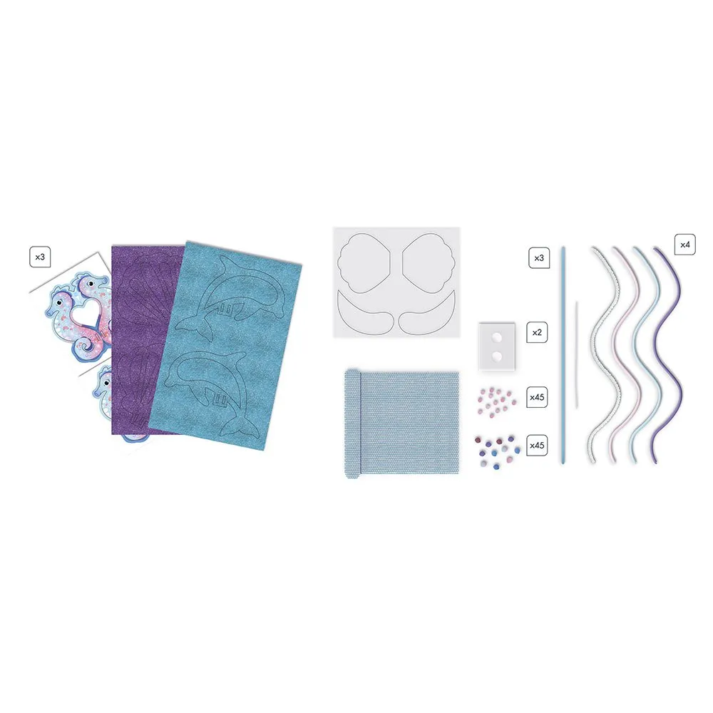 Täydennä merenneitopukusi luomalla oma taikasauvasi! Tämän luovan sarjan avulla voit tehdä 3 sauvaa ja se sisältää sinisen valmiiksi leikatun paljettilevyn, 1 violetin valmiiksi leikatun paljettilevyn, 1 valmiiksi leikatun painetun levyn, 1 valmiiksi leikatun läpinäkyvän levyn, sinisen tyllin, 45 simpukkapaljetteja, 45 pyöreitä paljetteja, 2 sateenkaarenvärisiä helmiä, 3 värjättyä puista sauvaa, 1 sateenkaarenvärisen paljettinauhan, 3 satiininauhaa (vaaleanpunainen, sininen, violetti), 1 joustavaa lankaa, 3 itse liimaavaa vaahtomuoviruutua ja 1 ohjekirjaa ja malleja sisältävän kirjan.