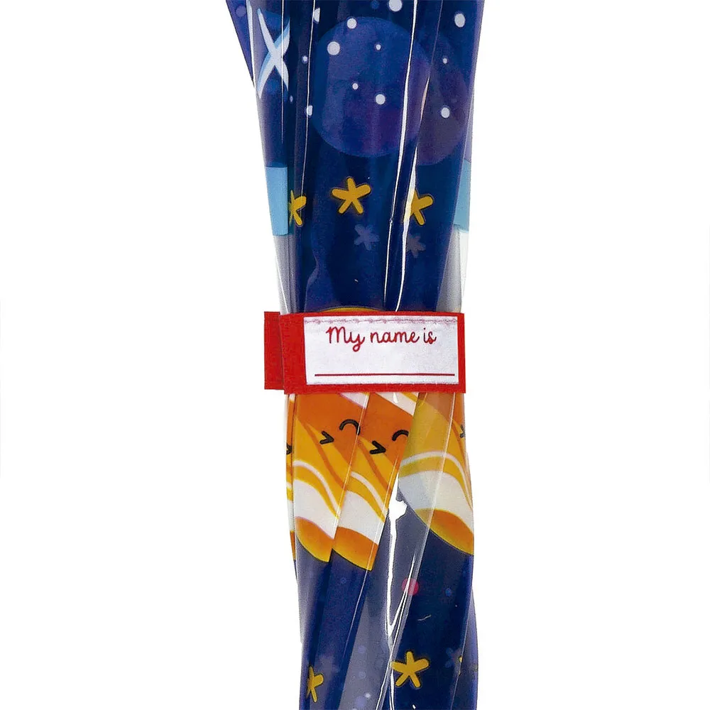 Toiminnallisuus kohtaa harkitun muotoilun viimeistä yksityiskohtaa myöten. Sateenvarjon mukana tulee yhteensopiva suojaholkki, jota koristaa sama kiehtova avaruusteema. Tämän avulla voit säilyttää märän sateenvarjosi käytön jälkeen kastelematta laukkusi sisältöä. Laadukas ja nopeasti kuivuva kuomu hylkii vettä tehokkaasti, mikä tarkoittaa, että sen voi pakata pois pian myrskyn jälkeen. Ergonominen, pehmeäpintainen kahva tarjoaa miellyttävän otteen matkasi aikana, varmistaen mukavan ja turvallisen pidon.