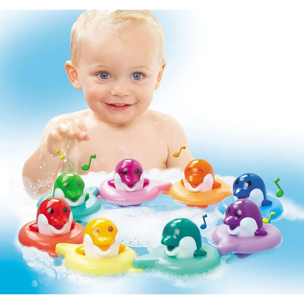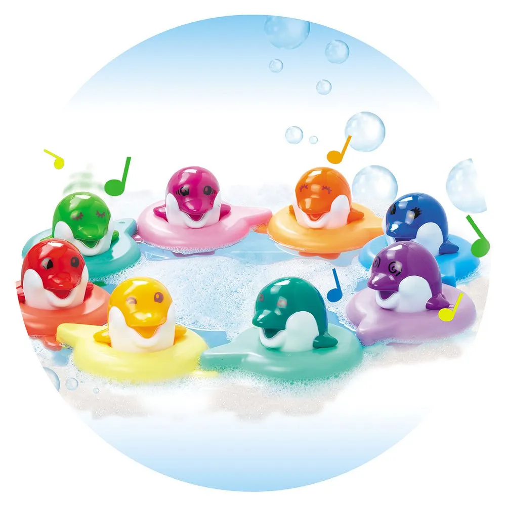 Kahdeksan sympaattista delfiiniä, joiden avulla lapsi voi säveltää omia melodioitaan kylpyhetken aikana.