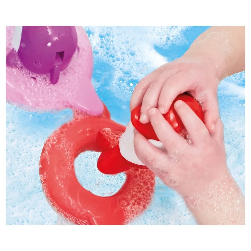 Do-Re-Mi -delfiinisetti on täynnä ominaisuuksia, jotka pitävät pienen muusikkosi viihtyneenä. Kokoelma sisältää kahdeksan kirkkaanväristä, iloista delfiiniä, joista jokainen on täydellisen kokoinen pienille käsille. Nämä ystävälliset merieläimet kelluvat iloisesti kylpyammeessa ja ne voidaan yhdistää häntästä evään luodakseen hauskan, kelluvan ketjun. Setti sisältää myös kahdeksan vastaavaa kelluvaa rengasta, jotka tarjoavat hauskan värien yhdistämispelin. Aseta delfiinit renkaisiinsa, järjestä ne järjestykseen tai anna niiden kellua vapaasti loputtomiin leikkimahdollisuuksiin. Kaiken lisäksi tämä lelu toimii ilman paristoja, varmistaen, että hauskuus on aina valmiina.