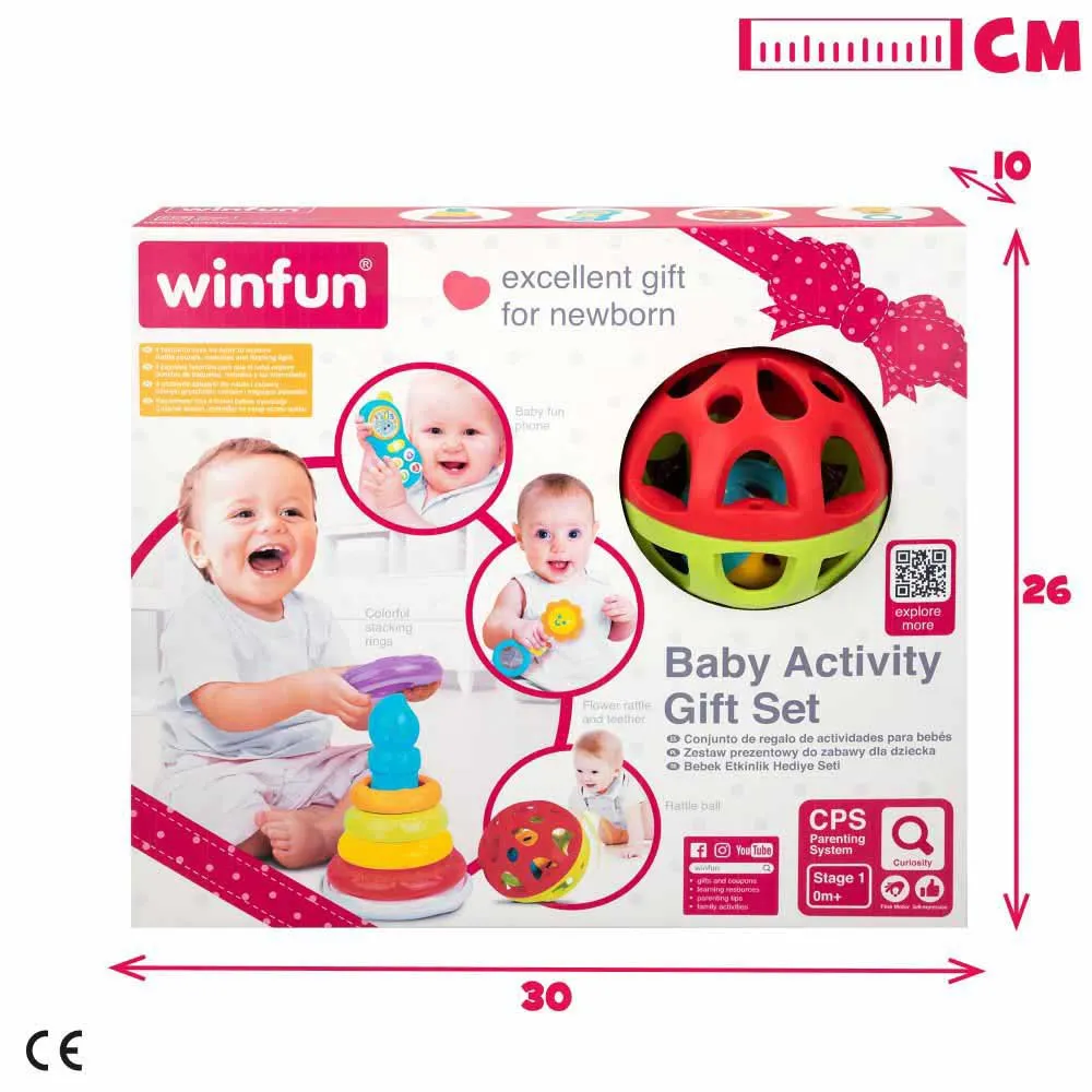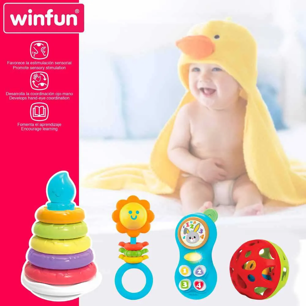 Anna vauvasi tutkia ja löytää vapaasti samalla kun hänellä on hauskaa tämän neljän Winfun-tarvikkeen setin kanssa! Jotkut näistä leluista, kuten helistin, puhelin ja pallo, ovat helppoja kuljettaa mukana kokonsa ansiosta.