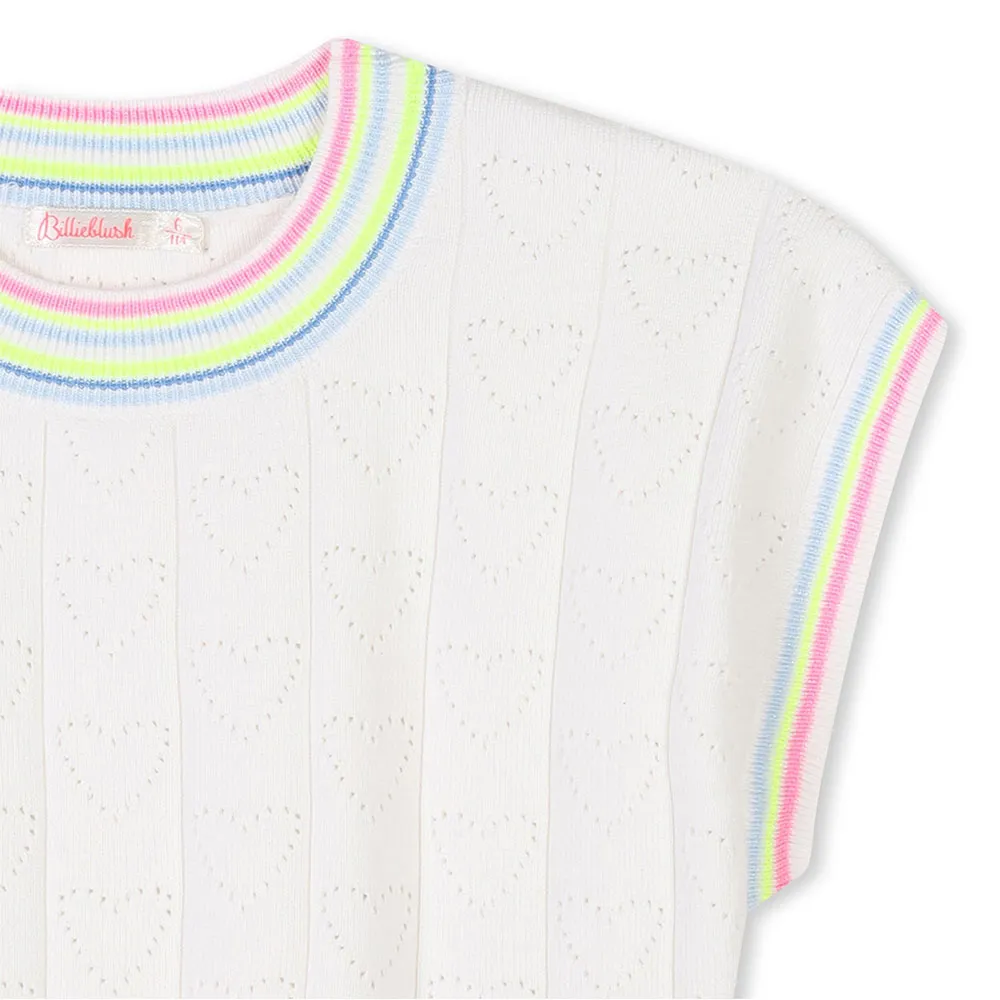 Pull en maille avec des coeurs ajourés, manches courtes, côtes rayées au col, aux manches et en bas, étiquette.