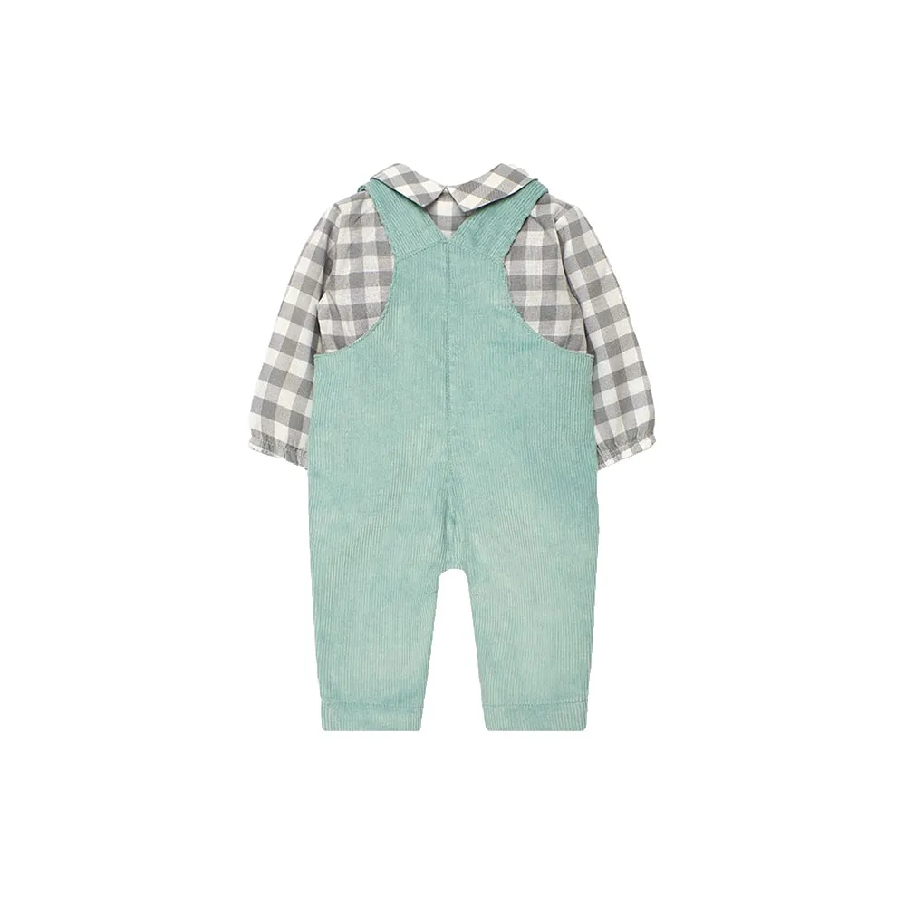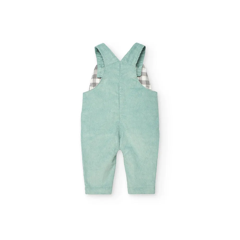Ensemble bébé en velours côtelé vert avec détails à carreaux, idéal pour la saison automne-hiver.
