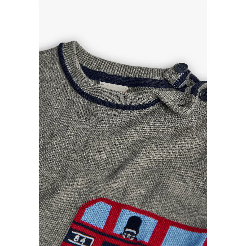 Pull en tricot pour garçons dans un ton gris sophistiqué, avec un charmant motif de bus orné de figurines d´animaux, ajoutant une touche amusante et unique.
