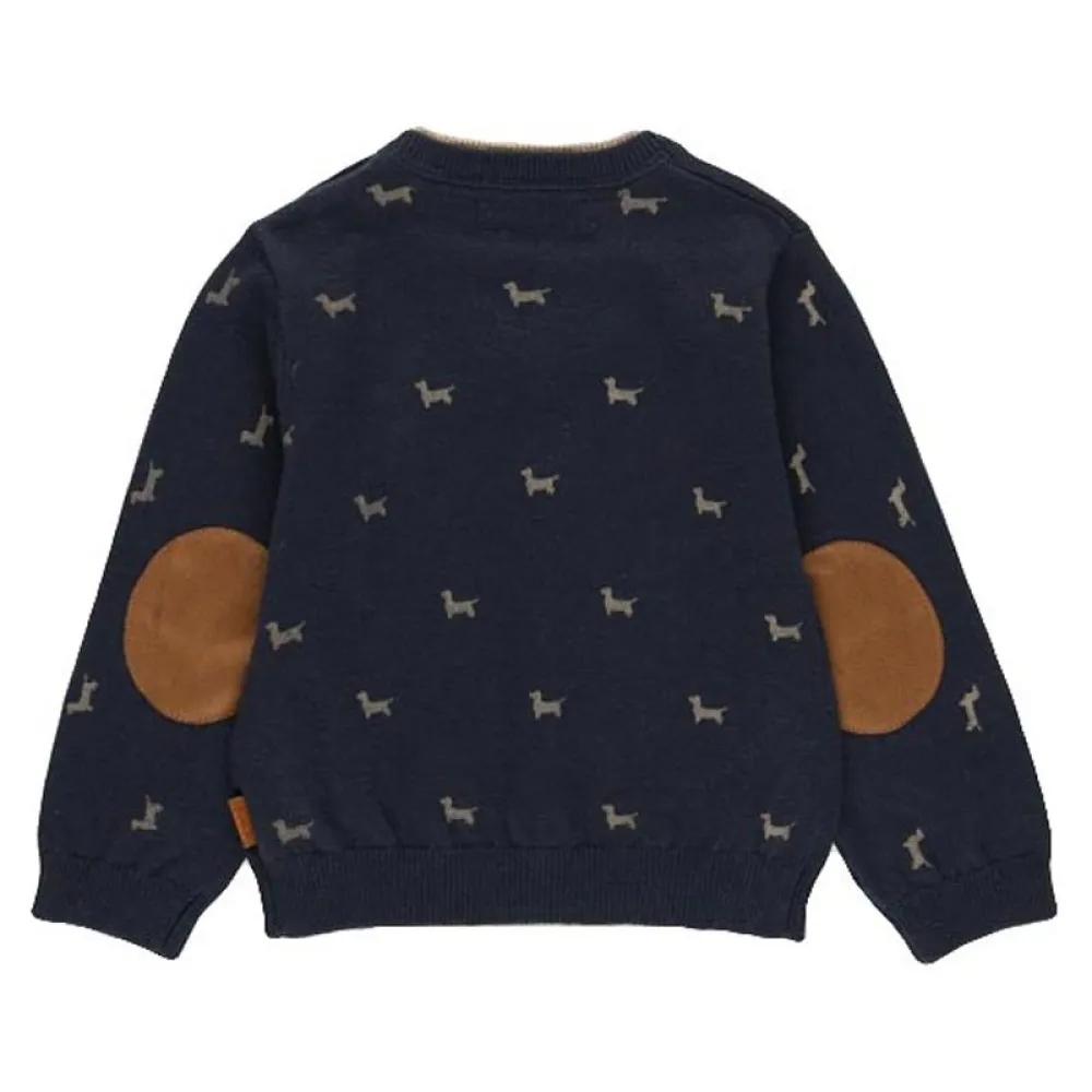 Pull en maille pour garçon. Le col se ferme par un bouton sans boutons. le pull a un imprimé teckel de couleur camel. il a un double col en V, des coudes en imitation daim et l'intérieur du col a des côtes camel.