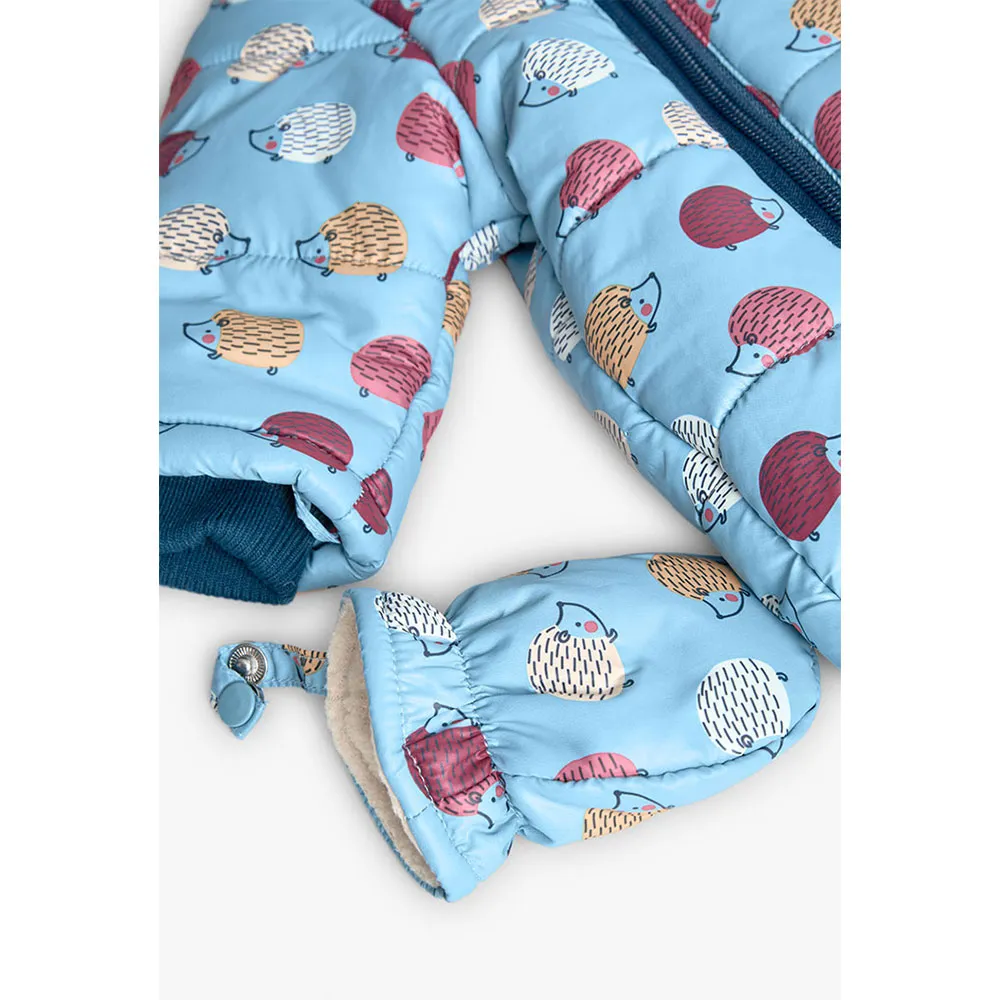 Combinaison intégrale pour bébé en tissu technique bleu avec imprimé animalier, un choix charmant pour la saison fraîche.