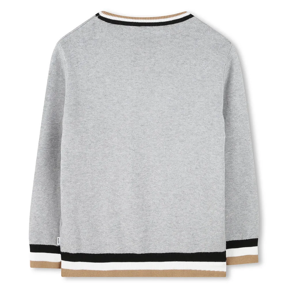 Découvrez un style intemporel avec le pull BOSS J51178, un chef-d´œuvre de la maille pour le garçon moderne. Confectionné avec expertise à partir d´un mélange de qualité supérieure de 90 % coton et 10 % laine, il offre une douceur luxueuse, une respirabilité et une chaleur sans l´encombrement, ce qui en fait une pièce de superposition idéale pour toutes les saisons. Ce col rond sophistiqué se distingue par des bandes tricolores emblématiques sur le col, les poignets et l´ourlet, ajoutant une touche athlétique subtile. Orné d´un logo BOSS imprimé sur la poitrine, ce pull polyvalent rehausse sans effort les tenues décontractées et élégantes avec un attrait raffiné et design
