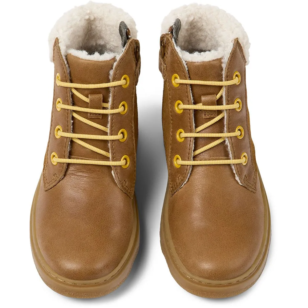 Bottes en cuir marron pour enfants avec fourrure en PET recyclé, semelles intérieures OrthoLite® amovibles et semelles extérieures en caoutchouc 100 % (20 % recyclées).
