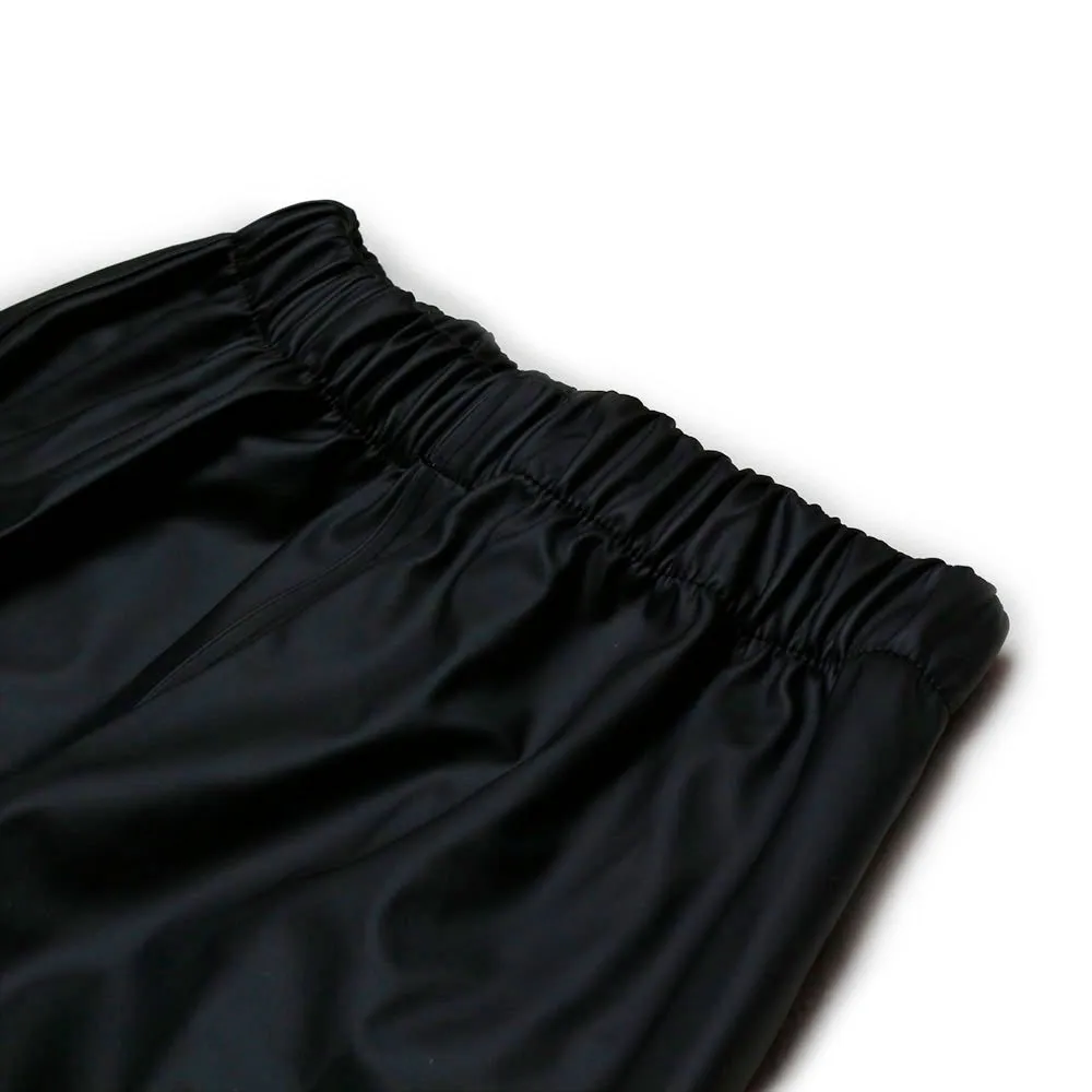 Le set de pluie a de nombreuses caractéristiques intéressantes telles qu´une capuche amovible avec des pressions, une fermeture frontale avec fermeture éclair et smaps, un élastique aux chevilles et aux poignets, et une fermeture velcro au poignet, des lacets élastiques et une bande réfléchissante sur le bras et la jambe droite.