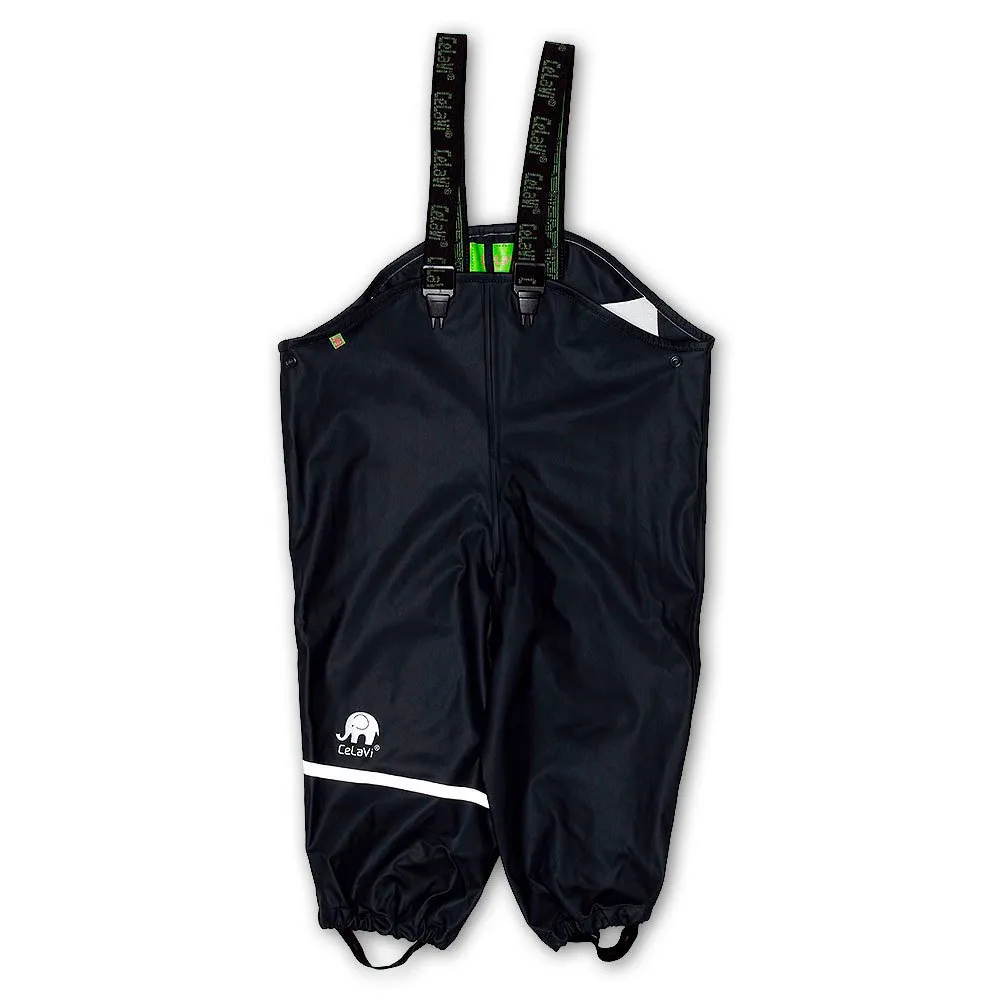 Dans les tailles 110-150, bien que dans certaines couleurs jusqu´à 170, les pantalons de pluie sont livrés avec une ceinture élastique (taille 110-140) et uniquement le logo Celavi sur la poitrine et la jambe.
