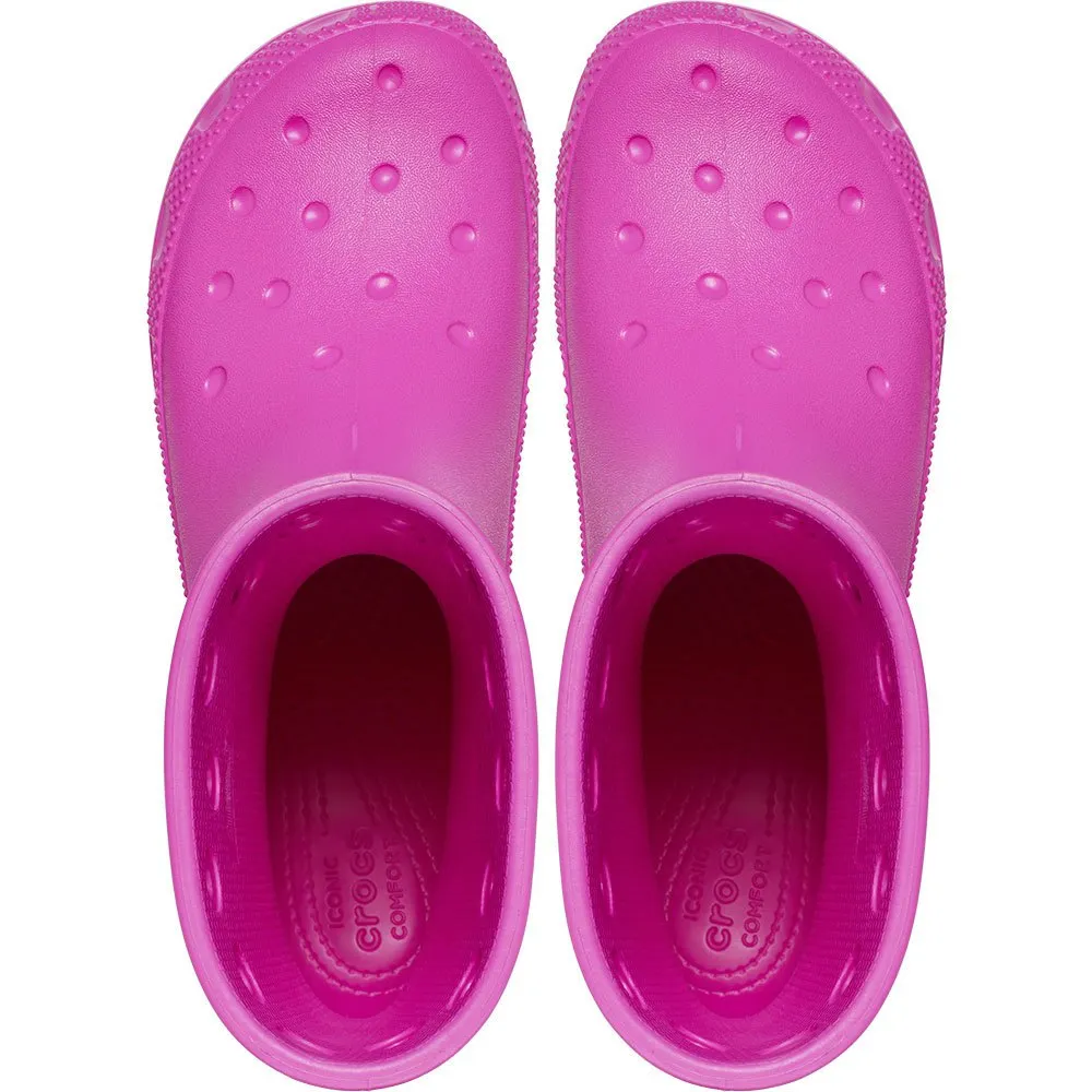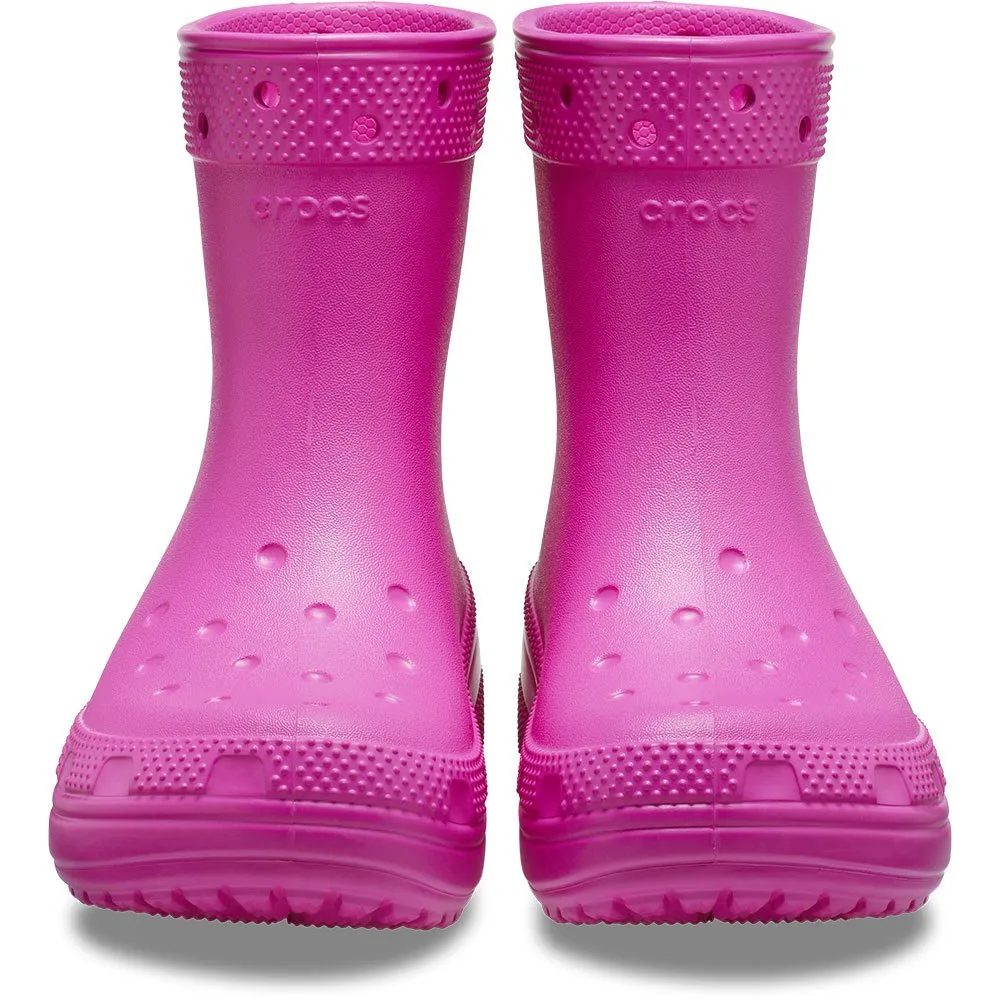 « Prenez l’essence de la Crocs Classic Clog, mettez-la dans la forme d’une botte fiable pour toutes les saisons et la Classic Boot est née. Une forme familière a évolué en une botte simple mais imperméable conçue pour les jours moins ensoleillés. Elles sont faciles à enfiler et à retirer et servent de moyen d’expression personnelle avec de la place pour les breloques Jibbitz™ sur le col. Quelles que soient les conditions, cette botte est prête à partir.