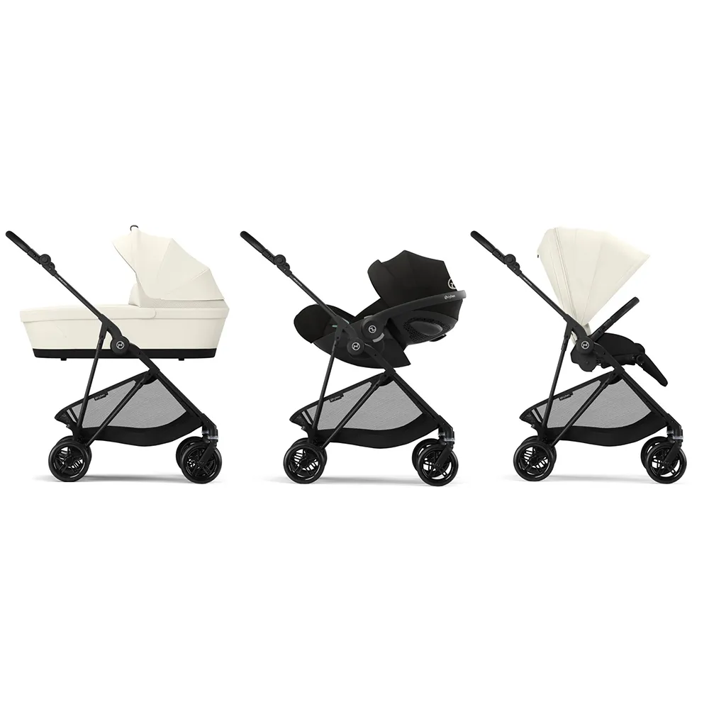 Prête à être utilisée comme Travel System, la poussette peut rapidement passer d´une nacelle Melio Cot, d´un siège auto pour bébé CYBEX et d´un siège pour s´adapter aux besoins du petit.